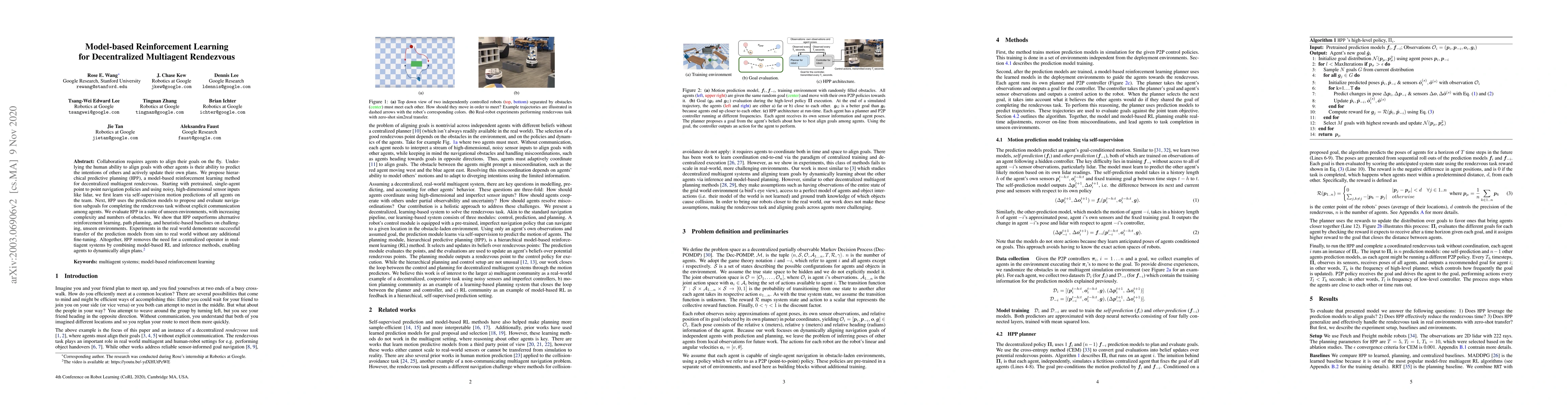Collaboration requires agents to align their goals on the fly. Underlying the human ability to align goals with other agents is their ability to predict the intentions of others and actively update their own plans. We propose hierarchical predictive planning (HPP), a model-based reinforcement learning method for decentralized multiagent rendezvous. Starting with pretrained, single-agent point to point navigation policies and using noisy, high-dimensional sensor inputs like lidar, we first learn via self-supervision motion predictions of all agents on the team. Next, HPP uses the prediction models to propose and evaluate navigation subgoals for completing the rendezvous task without explicit communication among agents. We evaluate HPP in a suite of unseen environments, with increasing complexity and numbers of obstacles. We show that HPP outperforms alternative reinforcement learning, path planning, and heuristic-based baselines on challenging, unseen environments. Experiments in the real world demonstrate successful transfer of the prediction models from sim to real world without any additional fine-tuning. Altogether, HPP removes the need for a centralized operator in multiagent systems by combining model-based RL and inference methods, enabling agents to dynamically align plans.