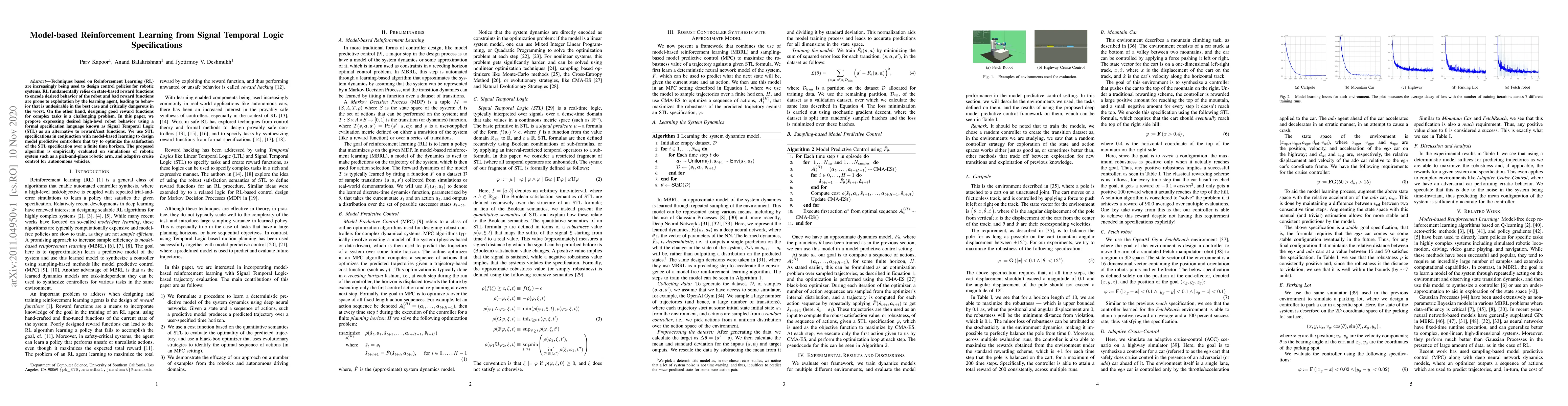 This paper proposes using Signal Temporal Logic (STL) specifications to define desired high-level robot behaviors instead of traditional reward functions in reinforcement learning. It combines STL with model-based learning to design predictive controllers optimizing STL satisfaction, and evaluates the approach through simulations of robotic systems.