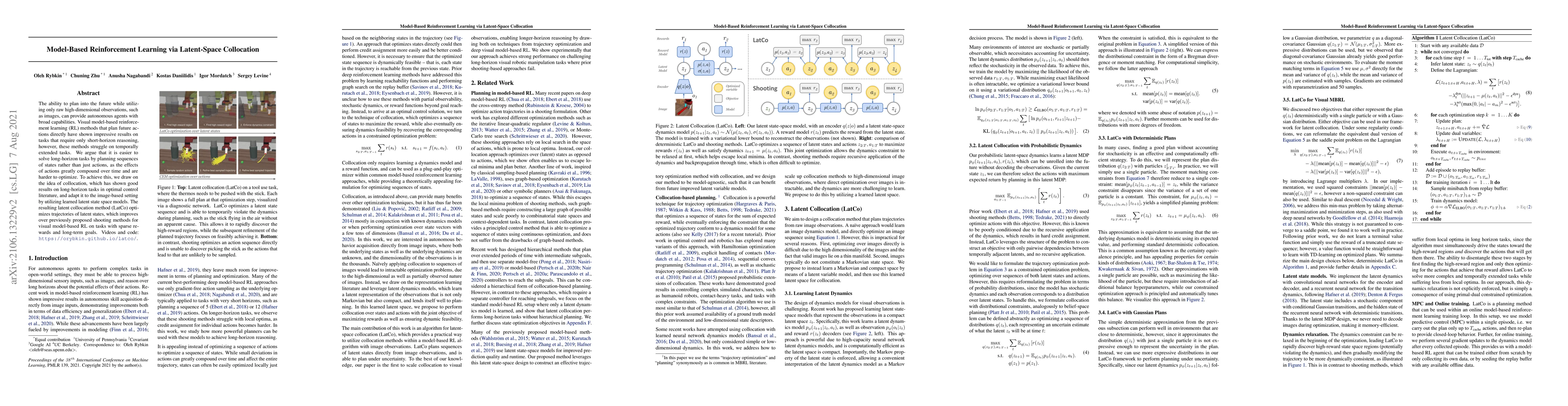 This paper proposes a latent collocation method (LatCo) for model-based reinforcement learning that optimizes sequences of latent states instead of just actions to improve performance on long-horizon tasks with sparse rewards. LatCo leverages learned latent state space models and outperforms shooting methods in visual model-based RL.