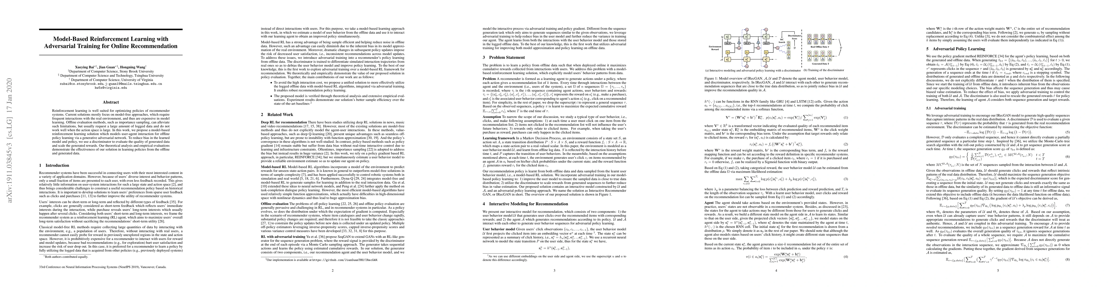This paper proposes a model-based reinforcement learning approach for online recommendation systems using adversarial training to improve offline policy learning. It employs a generative adversarial network to model user-agent interactions and a discriminator to reduce bias, demonstrating effective policy learning through theoretical analysis and empirical evaluations.