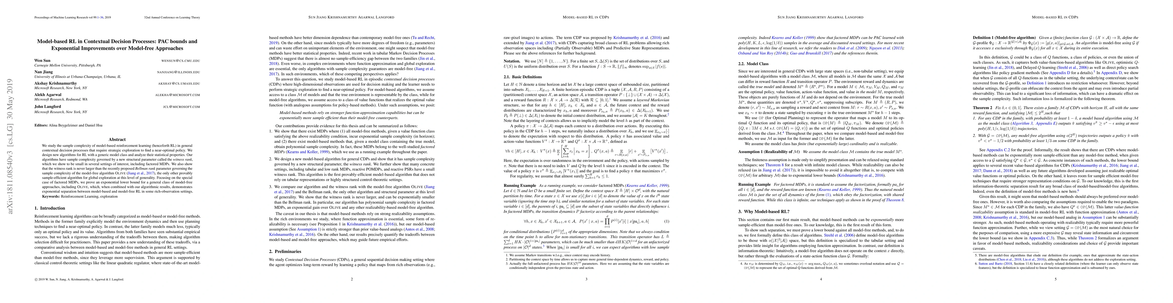 This paper explores model-based reinforcement learning in contextual decision processes, introducing new algorithms with improved sample complexity. It demonstrates that the witness rank parameter can lead to exponential improvements over model-free approaches, particularly in factored Markov decision processes.