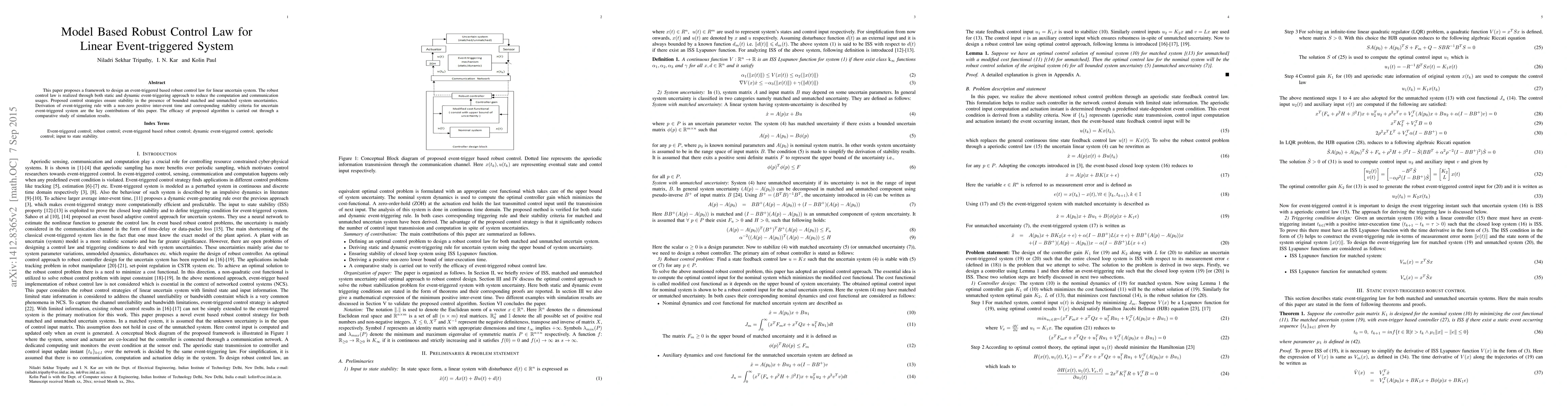 This paper proposes a framework to design an event-triggered based robust control law for linear uncertain system. The robust control law is realized through both static and dynamic event-triggering approach to reduce the computation and communication usages. Proposed control strategies ensure stability in the presence of bounded matched and unmatched system uncertainties. Derivation of event-triggering rule with a non-zero positive inter-event time and corresponding stability criteria for uncertain event-triggered system are the key contributions of this paper. The efficacy of proposed algorithm is carried out through a comparative study of simulation results.