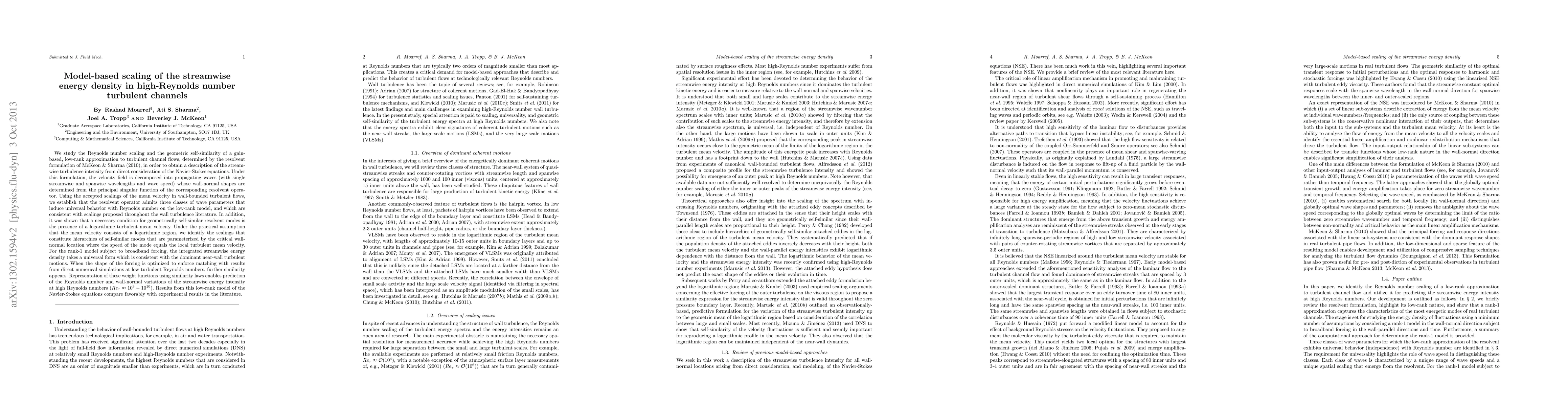 We study the Reynolds number scaling and the geometric self-similarity of a gain-based, low-rank approximation to turbulent channel flows, determined by the resolvent formulation of McKeon & Sharma (2010), in order to obtain a description of the streamwise turbulence intensity from direct consideration of the Navier-Stokes equations. Under this formulation, the velocity field is decomposed into propagating waves (with single streamwise and spanwise wavelengths and wave speed) whose wall-normal shapes are determined from the principal singular function of the corresponding resolvent operator. Using the accepted scalings of the mean velocity in wall-bounded turbulent flows, we establish that the resolvent operator admits three classes of wave parameters that induce universal behavior with Reynolds number on the low-rank model, and which are consistent with scalings proposed throughout the wall turbulence literature. In addition, it was shown that a necessary condition for geometrically self-similar resolvent modes is the presence of a logarithmic turbulent mean velocity. We identify the scalings that constitute hierarchies of self-similar modes that are parameterized by the critical wall-normal location where the speed of the mode equals the local turbulent mean velocity. For the rank-1 model subject to broadband forcing, the integrated streamwise energy density takes a universal form which is consistent with the dominant near-wall turbulent motions. When the shape of the forcing is optimized to enforce matching with results from direct numerical simulations at low turbulent Reynolds numbers, further similarity appears. Representation of these weight functions using similarity laws enables prediction of the Reynolds number and wall-normal variations of the streamwise energy intensity at high Reynolds numbers (${Re}_\tau \approx 10^3 - 10^{10}$).