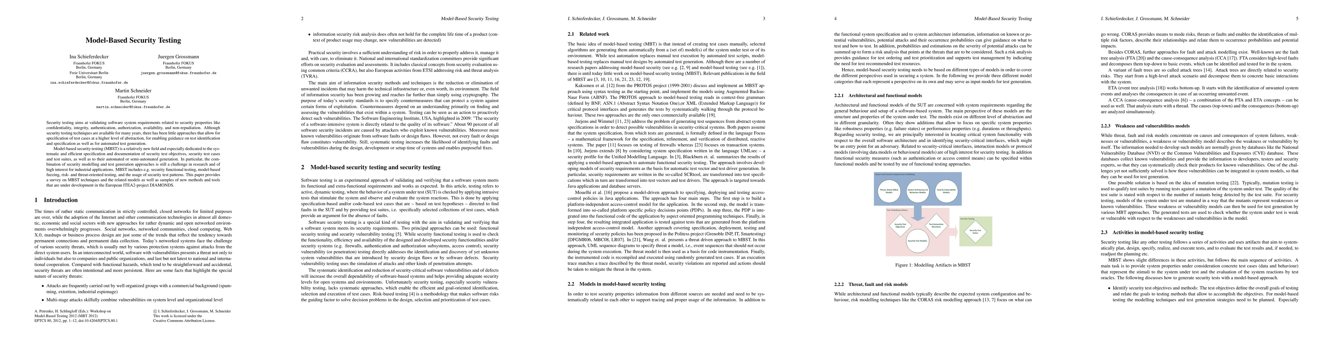 Security testing aims at validating software system requirements related to security properties like confidentiality, integrity, authentication, authorization, availability, and non-repudiation. Although security testing techniques are available for many years, there has been little approaches that allow for specification of test cases at a higher level of abstraction, for enabling guidance on test identification and specification as well as for automated test generation. Model-based security testing (MBST) is a relatively new field and especially dedicated to the systematic and efficient specification and documentation of security test objectives, security test cases and test suites, as well as to their automated or semi-automated generation. In particular, the combination of security modelling and test generation approaches is still a challenge in research and of high interest for industrial applications. MBST includes e.g. security functional testing, model-based fuzzing, risk- and threat-oriented testing, and the usage of security test patterns. This paper provides a survey on MBST techniques and the related models as well as samples of new methods and tools that are under development in the European ITEA2-project DIAMONDS.