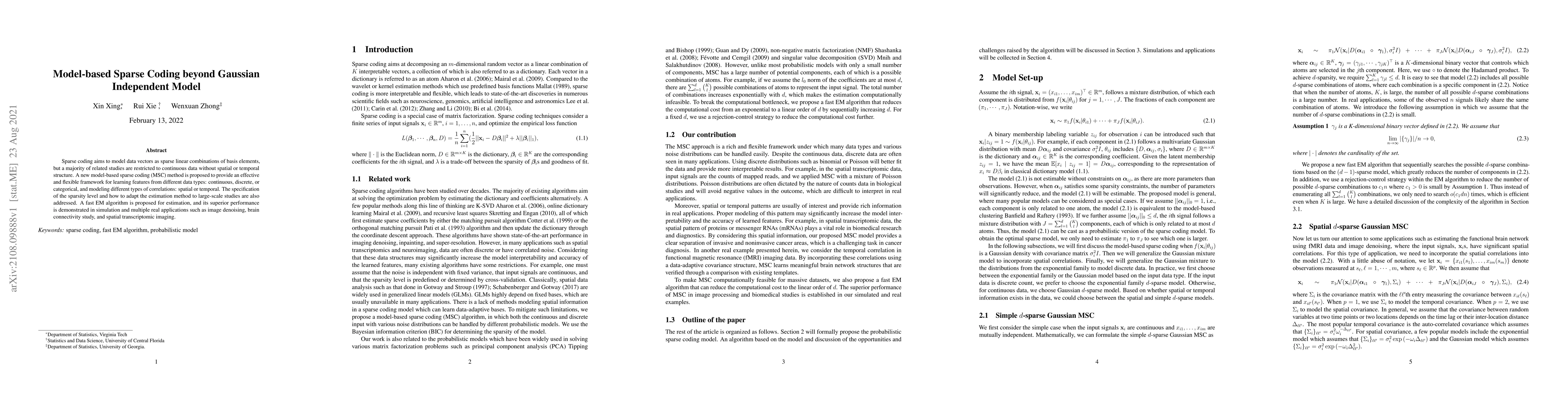 Sparse coding aims to model data vectors as sparse linear combinations of basis elements, but a majority of related studies are restricted to continuous data without spatial or temporal structure. A new model-based sparse coding (MSC) method is proposed to provide an effective and flexible framework for learning features from different data types: continuous, discrete, or categorical, and modeling different types of correlations: spatial or temporal. The specification of the sparsity level and how to adapt the estimation method to large-scale studies are also addressed. A fast EM algorithm is proposed for estimation, and its superior performance is demonstrated in simulation and multiple real applications such as image denoising, brain connectivity study, and spatial transcriptomic imaging.