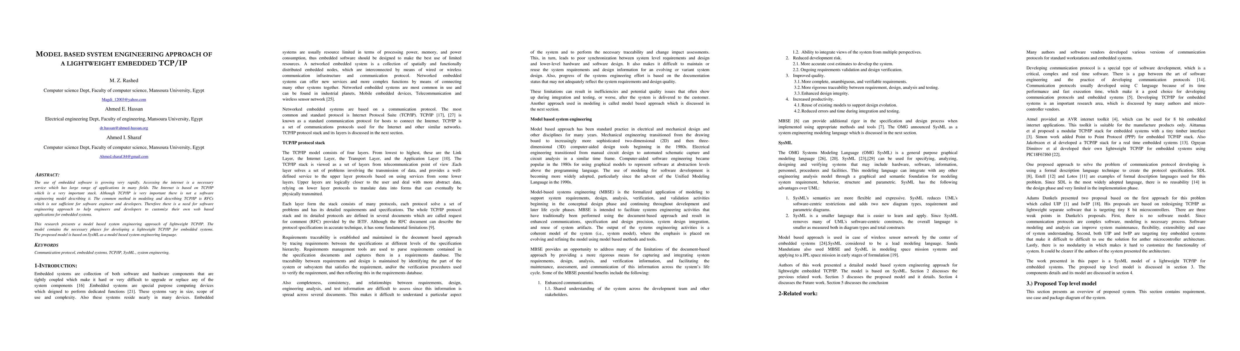 The use of embedded software is growing very rapidly. Accessing the internet is a necessary service which has large range of applications in many fields. The Internet is based on TCP/IP which is a very important stack. Although TCP/IP is very important there is not a software engineering model describing it. The common method in modeling and describing TCP/IP is RFCs which is not sufficient for software engineer and developers. Therefore there is a need for software engineering approach to help engineers and developers to customize their own web based applications for embedded systems. This research presents a model based system engineering approach of lightweight TCP/IP. The model contains the necessary phases for developing a lightweight TCP/IP for embedded systems. The proposed model is based on SysML as a model based system engineering language.