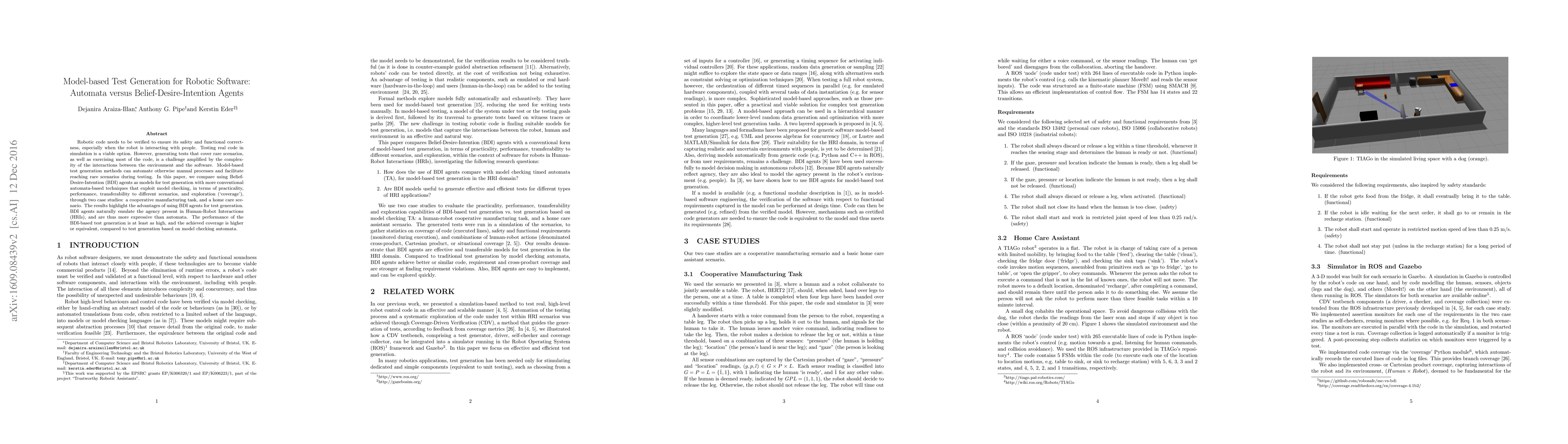 This paper compares model-based test generation methods for robotic software, focusing on Belief-Desire-Intention (BDI) agents versus automata-based techniques. The results show that BDI agents provide better coverage and are more expressive in emulating human-robot interactions, while maintaining comparable performance.