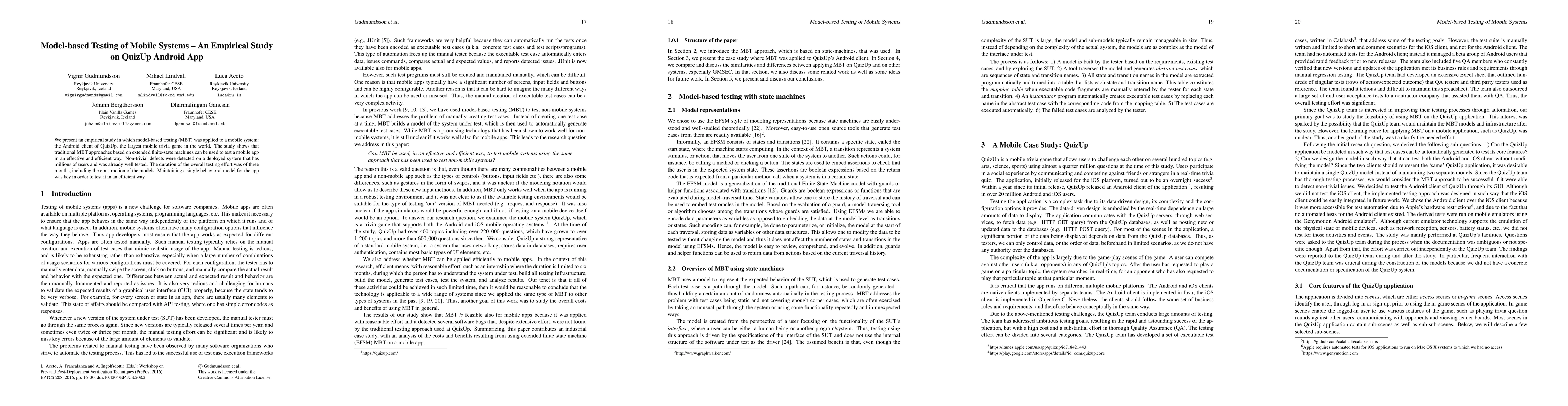 This study applies model-based testing to the QuizUp Android app, demonstrating its effectiveness in detecting non-trivial defects despite the app's extensive prior testing. The three-month effort highlights the importance of maintaining a single behavioral model for efficient testing.