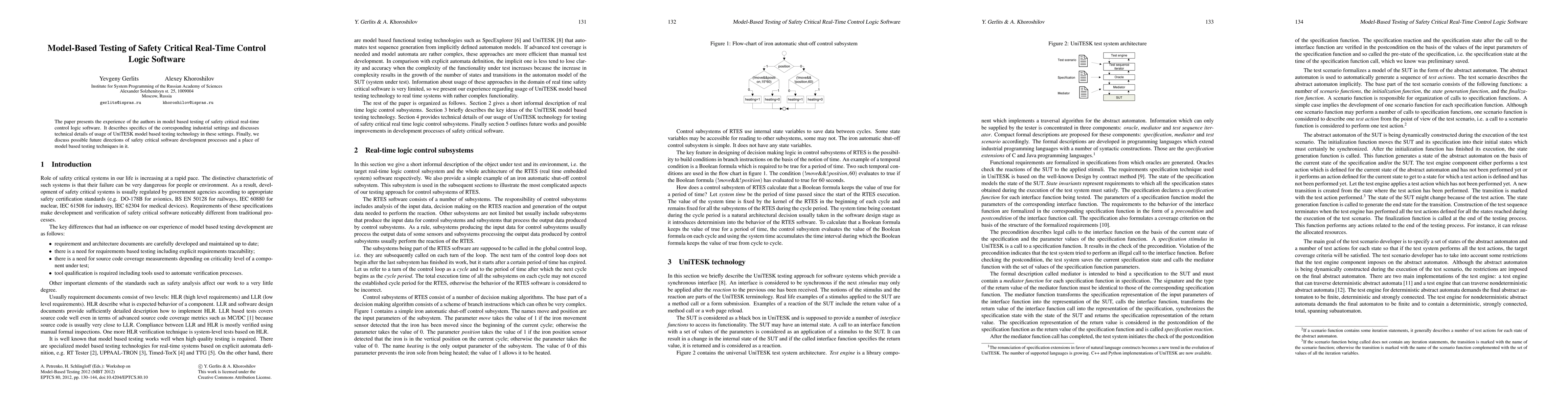 This paper explores the application of model-based testing using UniTESK technology for safety critical real-time control logic software, detailing its industrial implementation and discussing future trends in safety-critical software development.