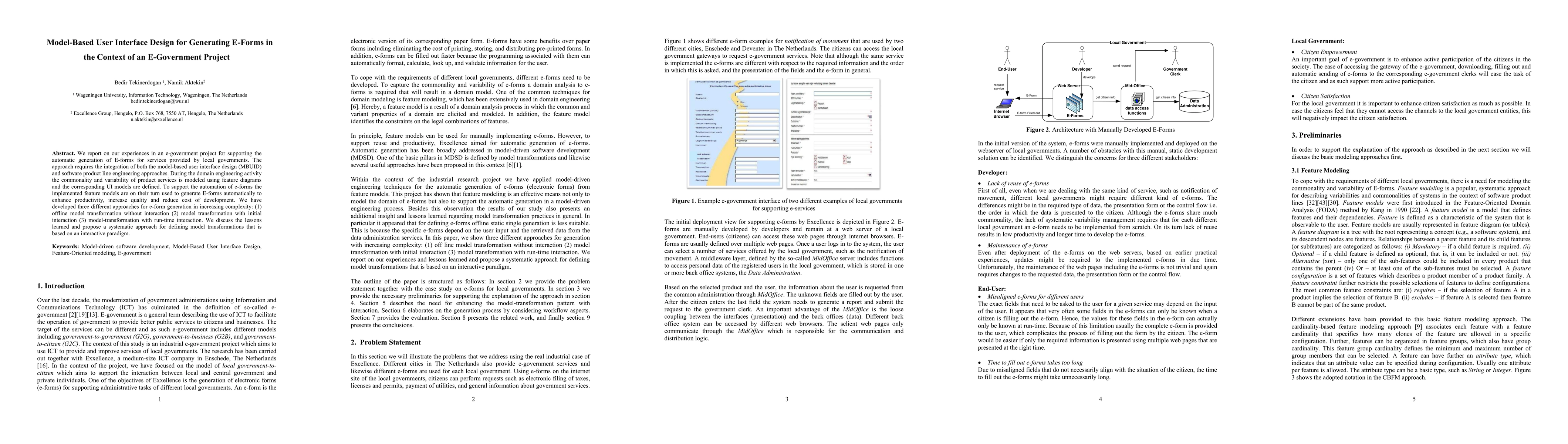 We report on our experiences in an e-government project for supporting the automatic generation of E-forms for services provided by local governments. The approach requires the integration of both the model-based user interface design (MBUID) and software product line engineering approaches. During the domain engineering activity the commonality and variability of product services is modeled using feature diagrams and the corresponding UI models are defined. To support the automation of e-forms the implemented feature models are on their turn used to generate E-forms automatically to enhance productivity, increase quality and reduce cost of development. We have developed three different approaches for e-form generation in increasing complexity: (1) offline model transformation without interaction (2) model transformation with initial interaction (3) model-transformation with run-time interaction. We discuss the lessons learned and propose a systematic approach for defining model transformations that is based on an interactive paradigm.