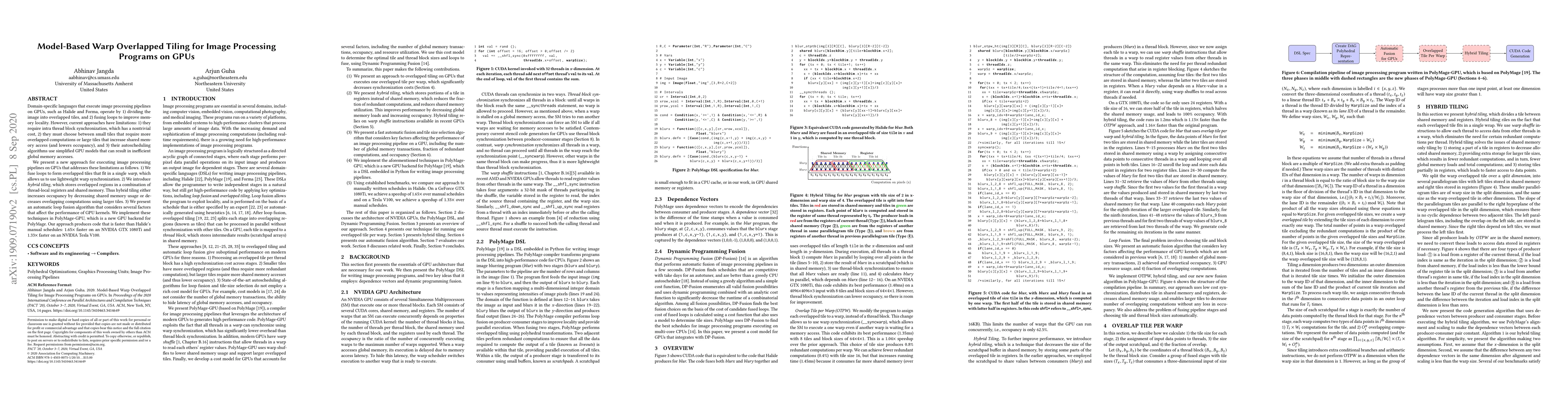 Domain-specific languages that execute image processing pipelineson GPUs, such as Halide and Forma, operate by 1) dividing the image into overlapped tiles, and 2) fusing loops to improve memory locality. However, current approaches have limitations: 1) they require intra thread block synchronization, which has a non-trivial cost, 2) they must choose between small tiles that require more overlapped computations or large tiles that increase shared memory access (and lowers occupancy), and 3) their autoscheduling algorithms use simplified GPU models that can result in inefficient global memory accesses. We present a new approach for executing image processing pipelines on GPUs that addresses these limitations as follows. 1) We fuse loops to form overlapped tiles that fit in a single warp, which allows us to use lightweight warp synchronization. 2) We introduce hybrid tiling, which stores overlapped regions in a combination of thread-local registers and shared memory. Thus hybrid tiling either increases occupancy by decreasing shared memory usage or decreases overlapping computations using larger tiles. 3) We present an automatic loop fusion algorithm that considers several factors that affect the performance of GPU kernels. We implement these techniques in PolyMage-GPU, which is a new GPU backend for PolyMage. Our approach produces code that is faster than Halide's manual schedules: 1.65x faster on an NVIDIA GTX 1080Ti and 1.33 faster on an NVIDIA Tesla V100.