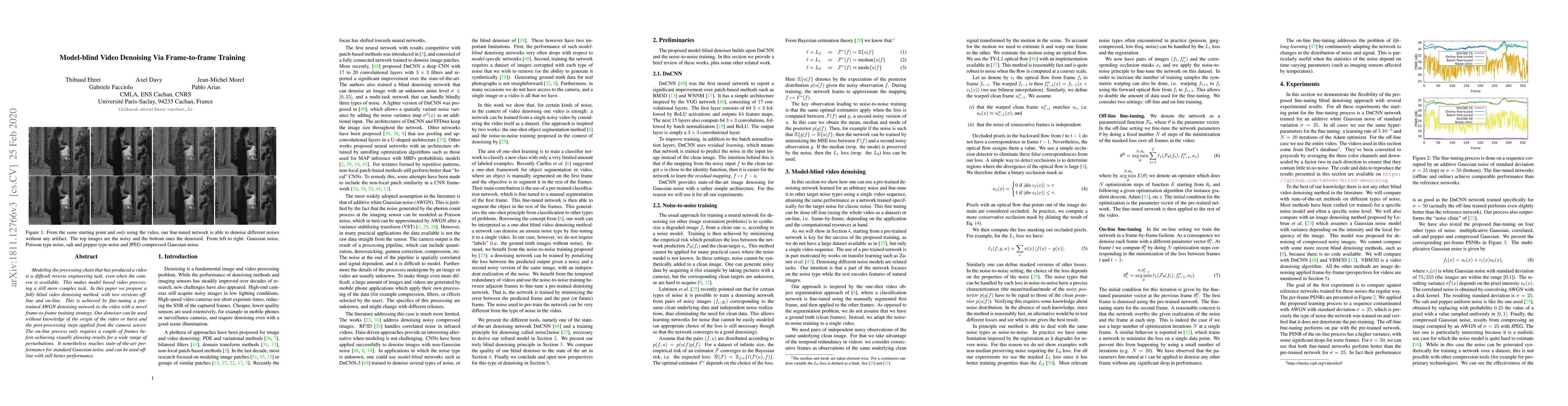 This paper proposes a model-blind video denoising method that fine-tunes a pre-trained AWGN denoiser using a frame-to-frame training strategy, achieving state-of-the-art results without knowledge of the video's origin or processing history. The on-line version quickly produces visually pleasing results, while the off-line version offers even better performance.