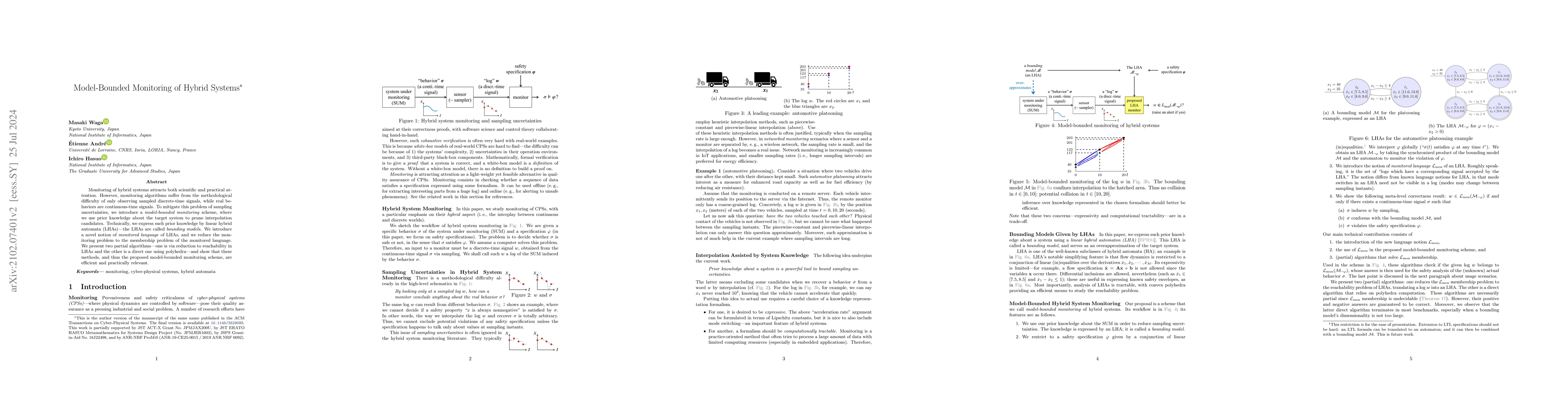 Monitoring of hybrid systems attracts both scientific and practical attention. However, monitoring algorithms suffer from the methodological difficulty of only observing sampled discrete-time signals, while real behaviors are continuous-time signals. To mitigate this problem of sampling uncertainties, we introduce a model-bounded monitoring scheme, where we use prior knowledge about the target system to prune interpolation candidates. Technically, we express such prior knowledge by linear hybrid automata (LHAs) - the LHAs are called bounding models. We introduce a novel notion of monitored language of LHAs, and we reduce the monitoring problem to the membership problem of the monitored language. We present two partial algorithms - one is via reduction to reachability in LHAs and the other is a direct one using polyhedra - and show that these methods, and thus the proposed model-bounded monitoring scheme, are efficient and practically relevant.