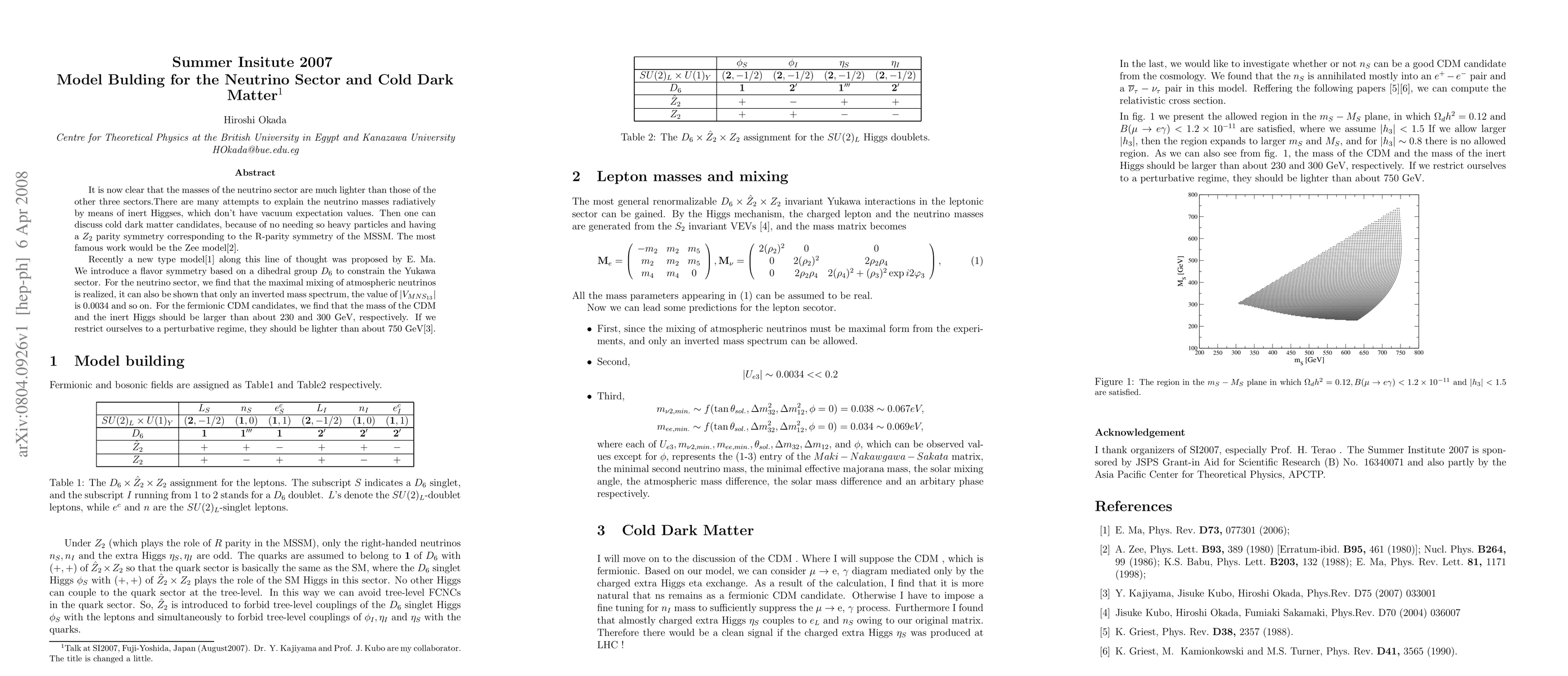 It is now clear that the masses of the neutrino sector are much lighter than those of the other three sectors.There are many attempts to explain the neutrino masses radiatively by means of inert Higgses, which don't have vacuum expectation values. Then one can discuss cold dark matter candidates, because of no needing so heavy particles and having a $Z_2$ parity symmetry corresponding to the R-parity symmetry of the MSSM. The most famous work would be the Zee model. Recently a new type model along this line of thought was proposed by E. Ma. We introduce a flavor symmetry based on a dihedral group $D_6$ to constrain the Yukawa sector. For the neutrino sector, we find that the maximal mixing of atmospheric neutrinos is realized, it can also be shown that only an inverted mass spectrum, the value of $|V_{MNS_{13}}|$ is 0.0034 and so on. For the fermionic CDM candidates, we find that the mass of the CDM and the inert Higgs should be larger than about 230 and 300 GeV, respectively. If we restrict ourselves to a perturbative regime, they should be lighter than about 750 GeV.