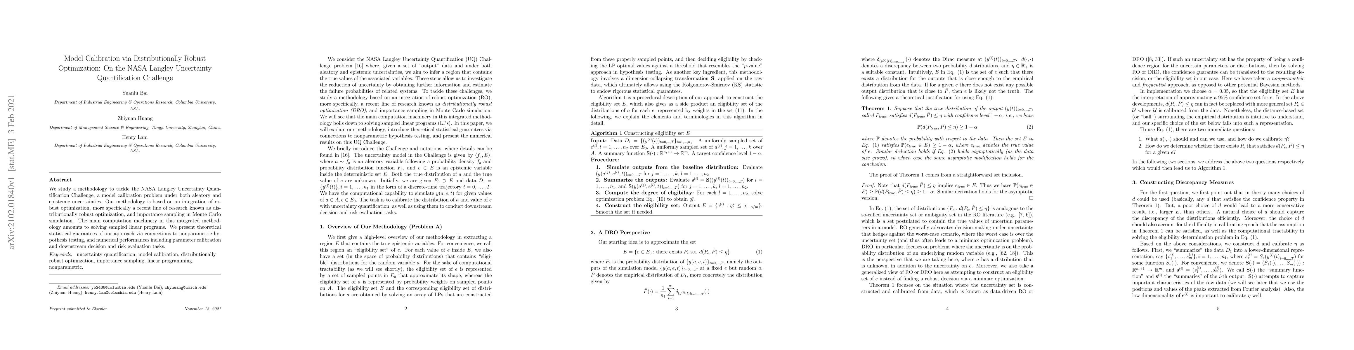 This paper proposes a distributionally robust optimization approach combined with importance sampling to tackle the NASA Langley Uncertainty Quantification Challenge, focusing on model calibration under both aleatory and epistemic uncertainties. The methodology involves solving sampled linear programs and provides theoretical statistical guarantees linked to nonparametric hypothesis testing, alongside demonstrating its numerical performance.