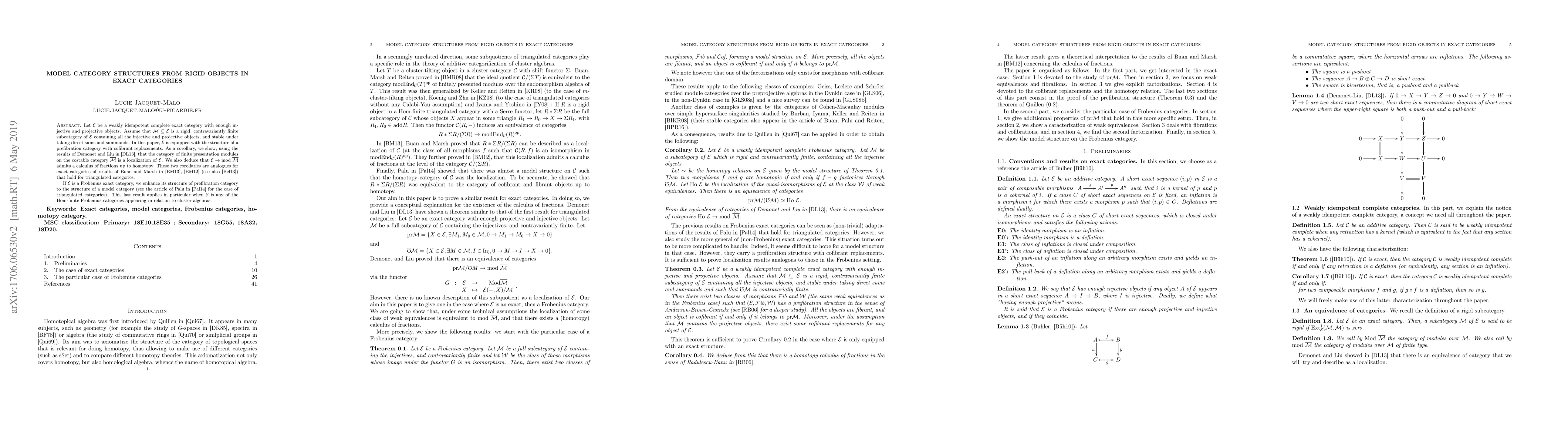 This paper explores the structure of a weakly idempotent complete exact category $\mathcal{E}$ with enough injective and projective objects, focusing on a rigid, contravariantly finite subcategory $\mathcal{M}$. It equips $\mathcal{E}$ with a prefibration category structure and shows that $\mathcal{E}$ localizes to the category of finite presentation modules on $\overline{\mathcal{M}}$. For Frobenius exact categories, $\mathcal{E}$ is further enhanced to a model category structure.