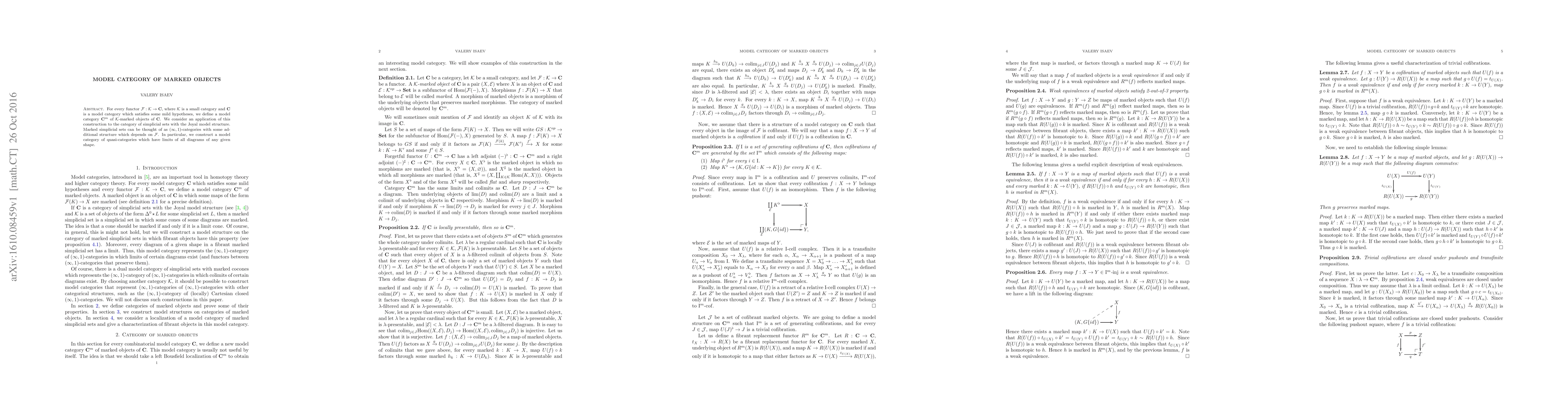 This paper introduces a model category $\mathbf{C}^m$ of $\mathcal{K}$-marked objects for any functor $\mathcal{F}: \mathcal{K} \to \mathbf{C}$, where $\mathcal{K}$ is a small category and $\mathbf{C}$ is a model category. It applies this construction to simplicial sets, resulting in $(\infty,1)$-categories with specific $\mathcal{F}$-dependent structure, and constructs a model for quasi-categories with universal limits.