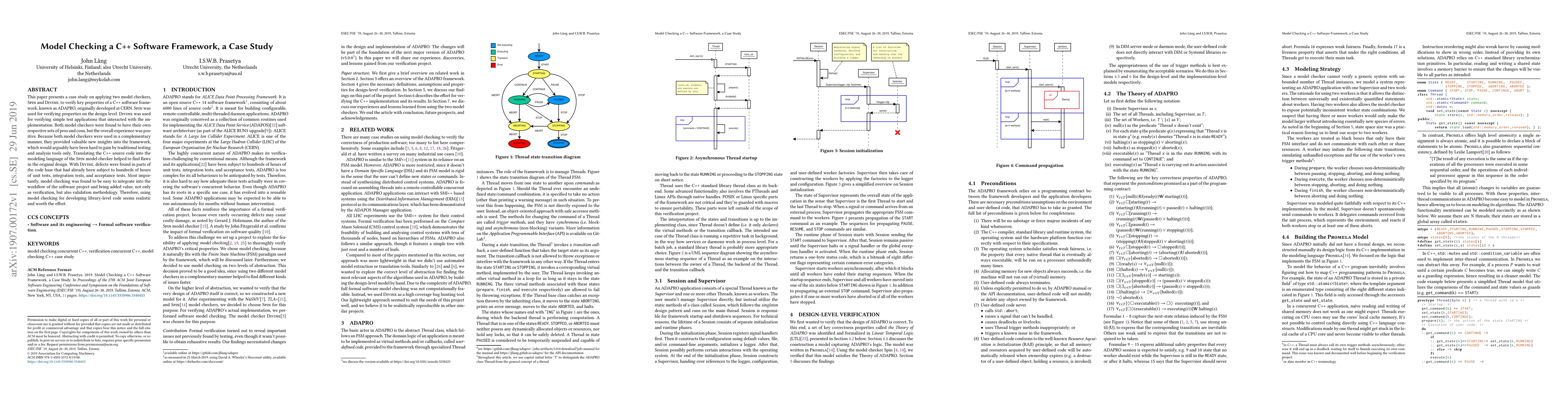 This paper presents a case study on applying two model checkers, SPIN and DIVINE, to verify key properties of a C++ software framework, known as ADAPRO, originally developed at CERN. SPIN was used for verifying properties on the design level. DIVINE was used for verifying simple test applications that interacted with the implementation. Both model checkers were found to have their own respective sets of pros and cons, but the overall experience was positive. Because both model checkers were used in a complementary manner, they provided valuable new insights into the framework, which would arguably have been hard to gain by traditional testing and analysis tools only. Translating the C++ source code into the modeling language of the SPIN model checker helped to find flaws in the original design. With DIVINE, defects were found in parts of the code base that had already been subject to hundreds of hours of unit tests, integration tests, and acceptance tests. Most importantly, model checking was found to be easy to integrate into the workflow of the software project and bring added value, not only as verification, but also validation methodology. Therefore, using model checking for developing library-level code seems realistic and worth the effort.