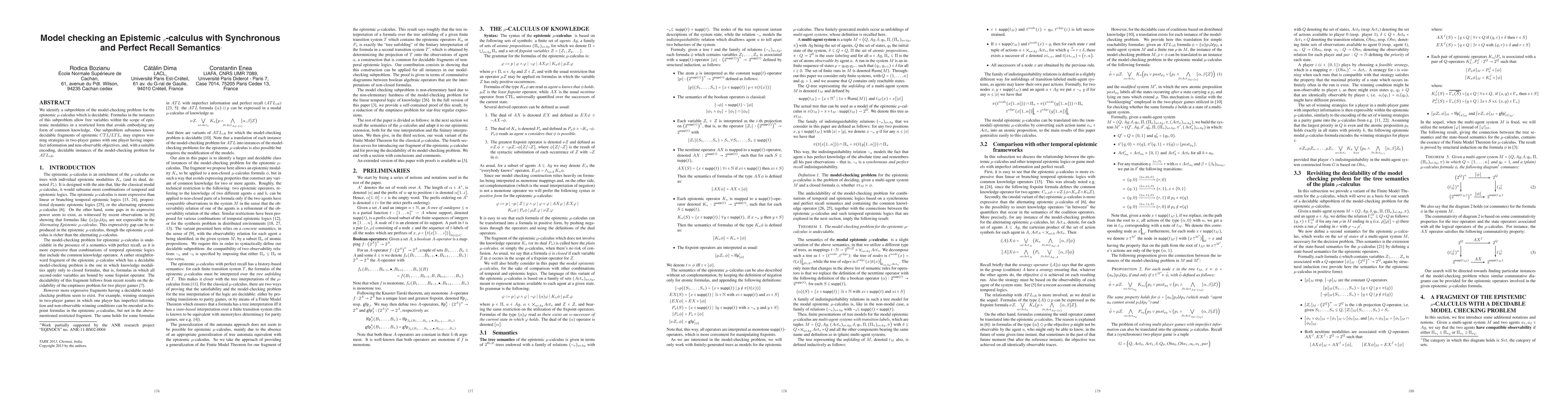This paper presents a decidable subproblem of model-checking for the epistemic μ-calculus, avoiding common knowledge and encompassing known decidable fragments of epistemic CTL/LTL. It also expresses winning strategies in two-player games with imperfect information.