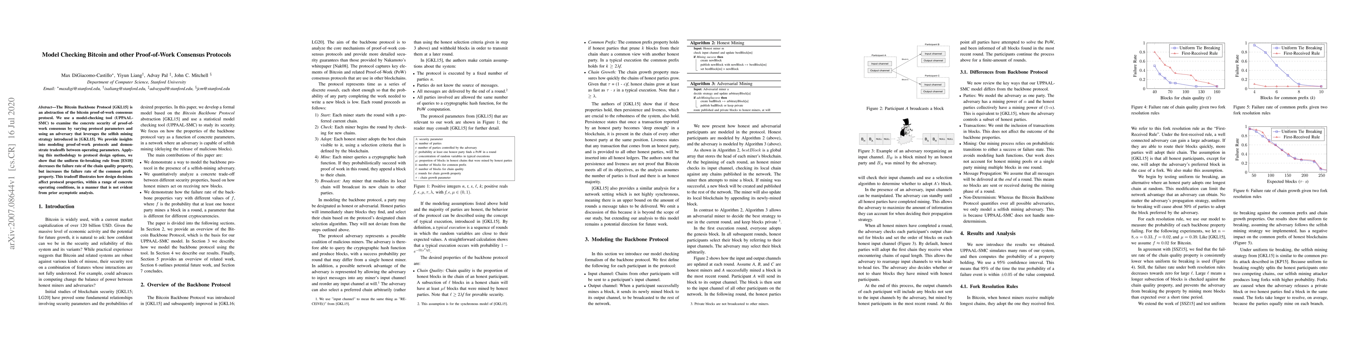 The Bitcoin Backbone Protocol [GKL15] is an abstraction of the bitcoin proof-of-work consensus protocol. We use a model-checking tool (UPPAALSMC) to examine the concrete security of proof-ofwork consensus by varying protocol parameters and using an adversary that leverages the selfish mining strategy introduced in [GKL15]. We provide insights into modeling proof-of-work protocols and demonstrate tradeoffs between operating parameters. Applying this methodology to protocol design options, we show that the uniform tie-breaking rule from [ES18] decreases the failure rate of the chain quality property, but increases the failure rate of the common prefix property. This tradeoff illustrates how design decisions affect protocol properties, within a range of concrete operating conditions, in a manner that is not evident from prior asymptotic analysis.