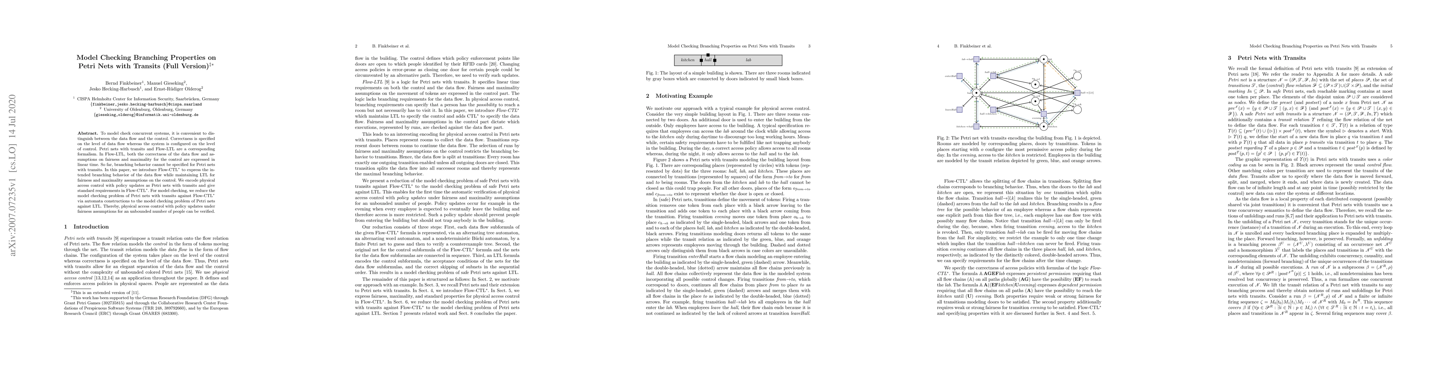 This paper introduces Flow-CTL* to specify branching behavior in Petri nets with transits, enabling model checking for concurrent systems. It translates this into an LTL-based model checking problem, allowing verification of physical access control policies with fairness assumptions for an unbounded number of users.