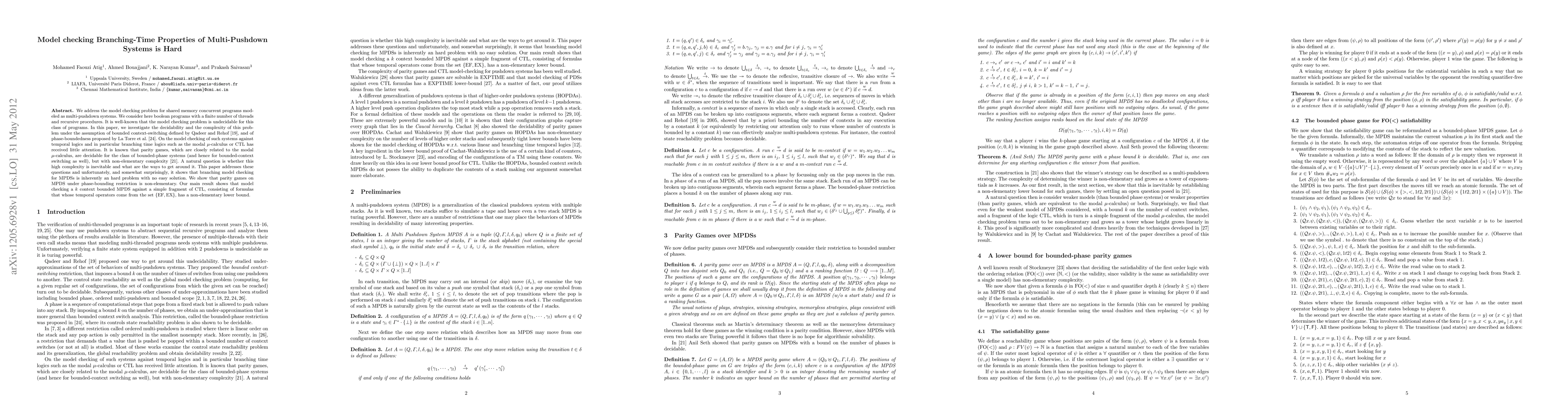 We address the model checking problem for shared memory concurrent programs modeled as multi-pushdown systems. We consider here boolean programs with a finite number of threads and recursive procedures. It is well-known that the model checking problem is undecidable for this class of programs. In this paper, we investigate the decidability and the complexity of this problem under the assumption of bounded context-switching defined by Qadeer and Rehof, and of phase-boundedness proposed by La Torre et al. On the model checking of such systems against temporal logics and in particular branching time logics such as the modal $\mu$-calculus or CTL has received little attention. It is known that parity games, which are closely related to the modal $\mu$-calculus, are decidable for the class of bounded-phase systems (and hence for bounded-context switching as well), but with non-elementary complexity (Seth). A natural question is whether this high complexity is inevitable and what are the ways to get around it. This paper addresses these questions and unfortunately, and somewhat surprisingly, it shows that branching model checking for MPDSs is inherently an hard problem with no easy solution. We show that parity games on MPDS under phase-bounding restriction is non-elementary. Our main result shows that model checking a $k$ context bounded MPDS against a simple fragment of CTL, consisting of formulas that whose temporal operators come from the set ${\EF, \EX}$, has a non-elementary lower bound.