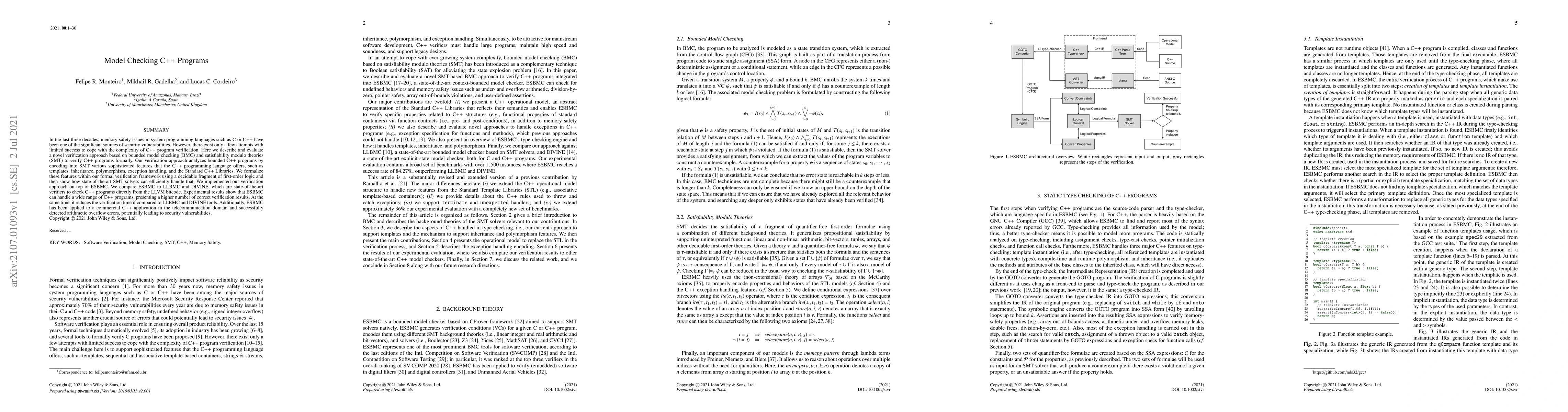 This paper introduces a novel verification approach for C++ programs using bounded model checking and SMT solvers, successfully encoding complex C++ features into a decidable logic framework. Experimental results demonstrate ESBMC's superior performance over LLBMC and DIVINE in verifying a wide range of C++ programs and detecting security vulnerabilities.