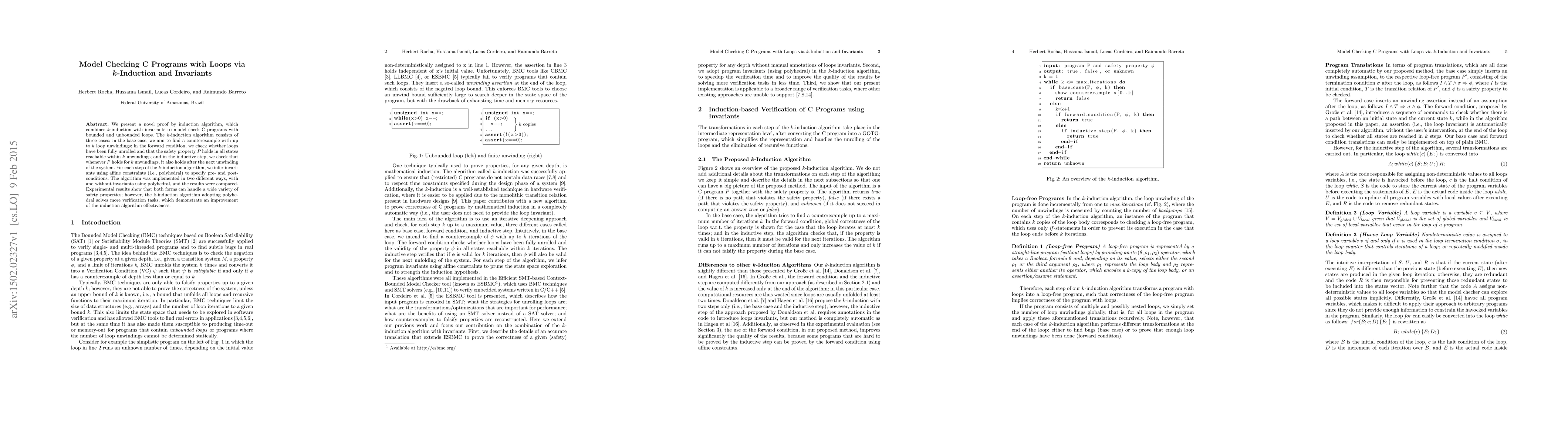 This paper introduces a k-induction algorithm combining invariants and polyhedral constraints to model check C programs with loops. Experimental results show that the version using polyhedral invariants outperforms the other in solving more verification tasks.