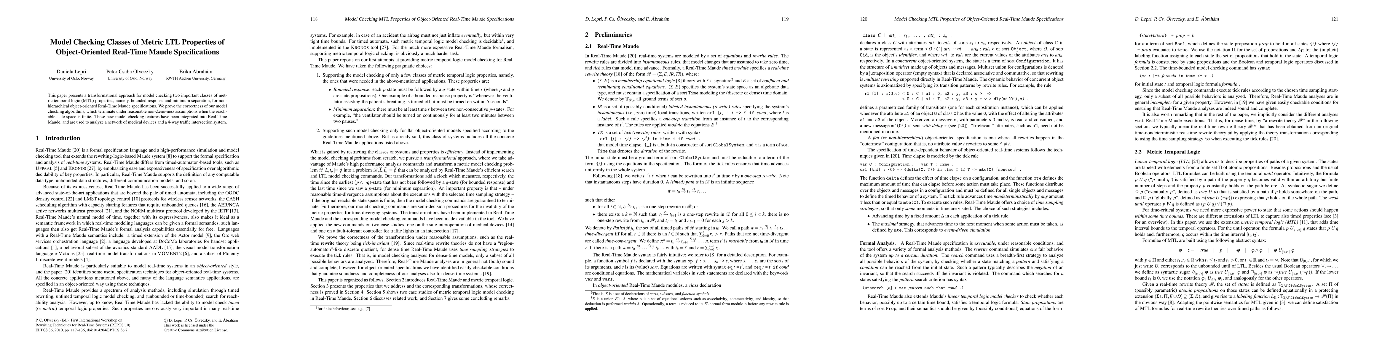 This paper introduces a transformational method for model checking bounded response and minimum separation metric temporal logic properties in nonhierarchical object-oriented Real-Time Maude specifications. The proposed model checking algorithms are proven correct and terminate under finite state space and non-Zeno assumptions.