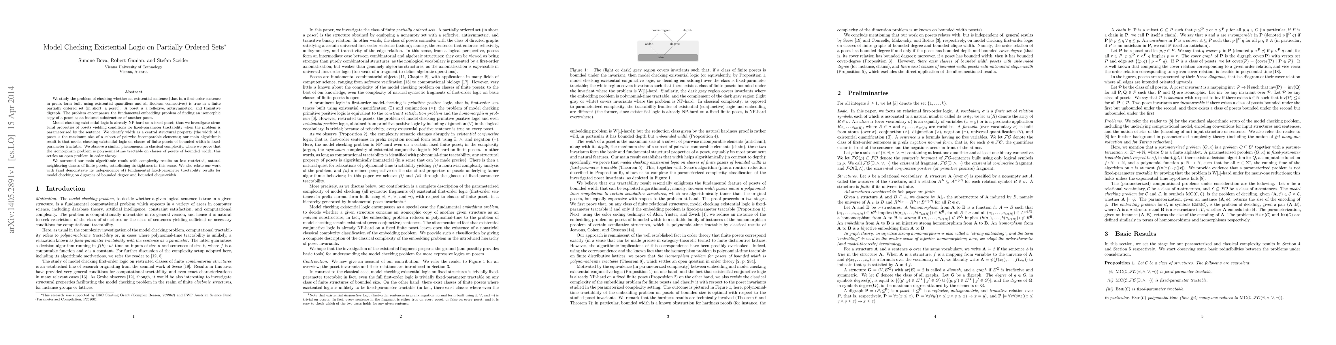 This paper investigates the complexity of verifying existential first-order logic sentences within finite partially ordered sets (posets) and demonstrates that model checking is fixed-parameter tractable when parameterized by the width of the poset. The authors establish the tractability of the embedding problem for posets with bounded width and relate their findings to complexity classes in classical order theory.