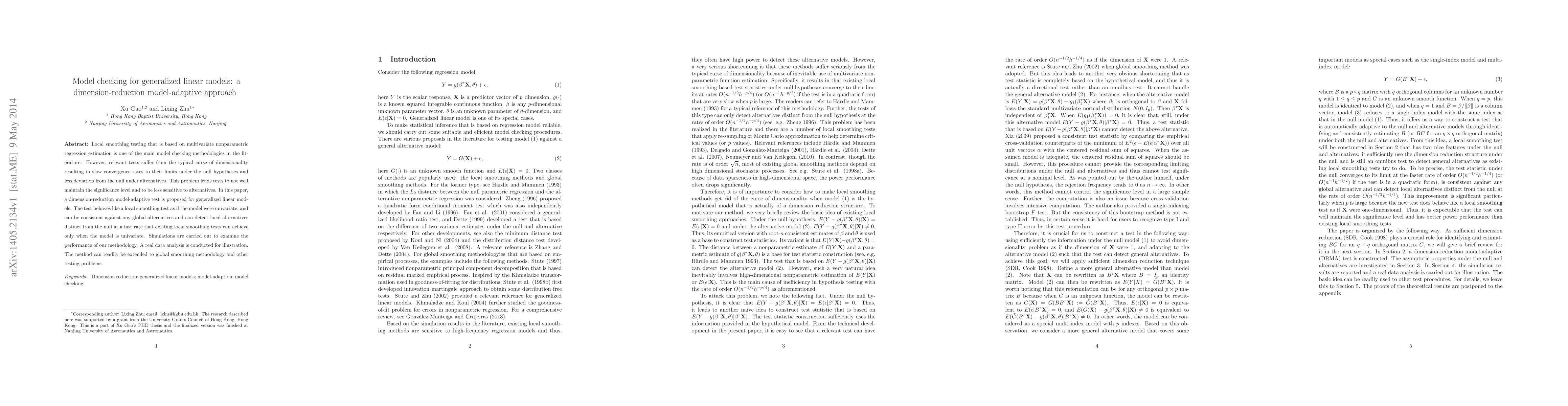 This paper proposes a dimension-reduction model-adaptive test for generalized linear models to address the slow convergence and reduced sensitivity of traditional local smoothing tests. The new test maintains significance levels and detects alternatives faster than existing methods.