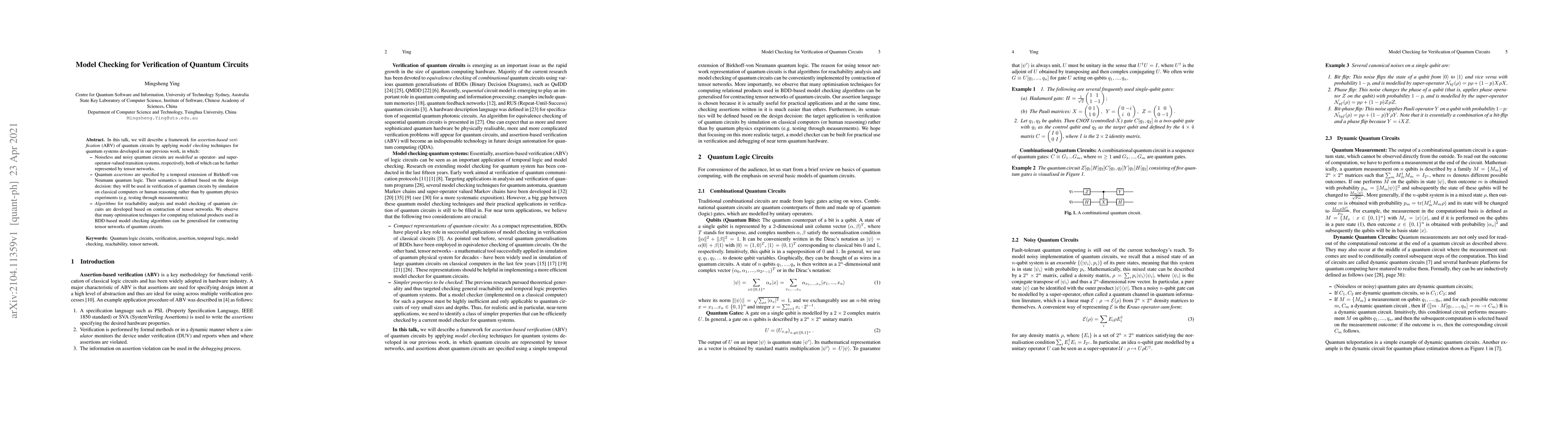 The paper presents a framework for assertion-based verification of quantum circuits using model checking techniques, leveraging tensor networks for efficient representation and simulation on classical computers.
