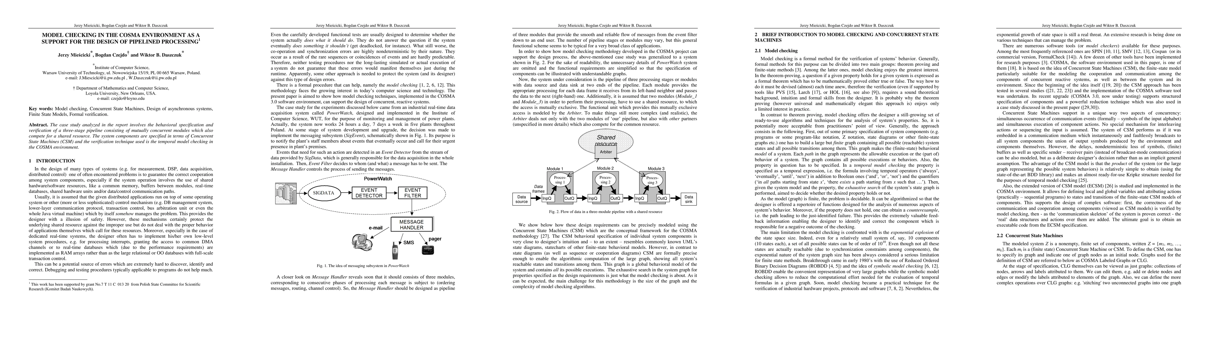 Summary: This paper explores the use of temporal model checking in the COSMA environment to verify a three-stage pipeline with concurrent modules competing for shared resources, specified through Concurrent State Machines. The study demonstrates the effectiveness of model checking in supporting pipelined processing design.