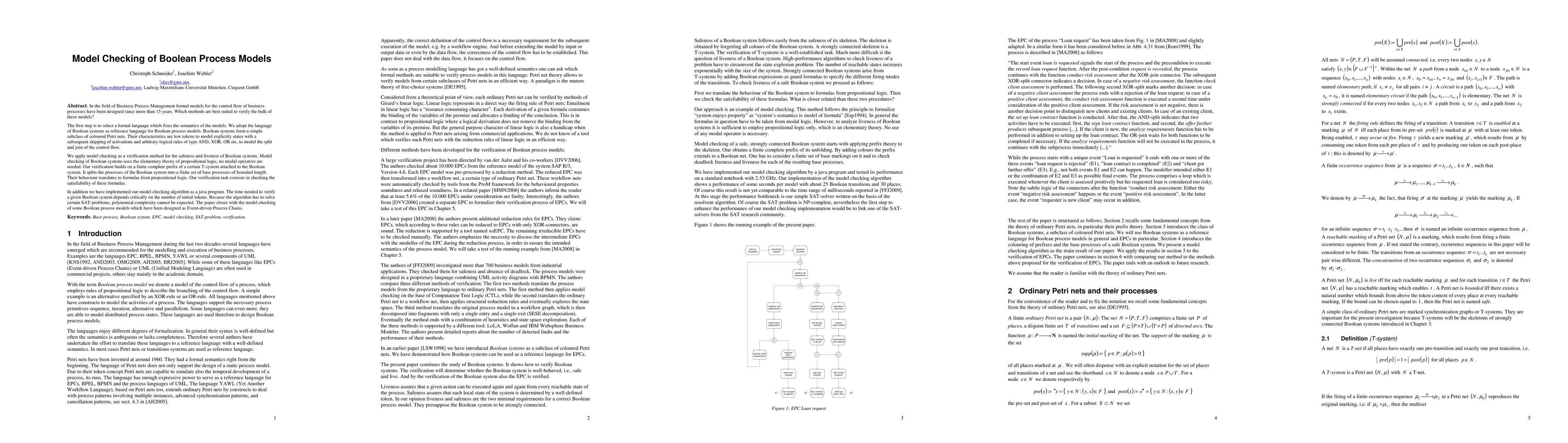 This paper explores the application of model checking for verifying Boolean process models, using a finite prefix of a T-system to break down processes into manageable logical formulas. The authors implement a Java program for this purpose, noting that verification time depends on the number of initial tokens and involves solving SAT-problems, thus lacking polynomial complexity.