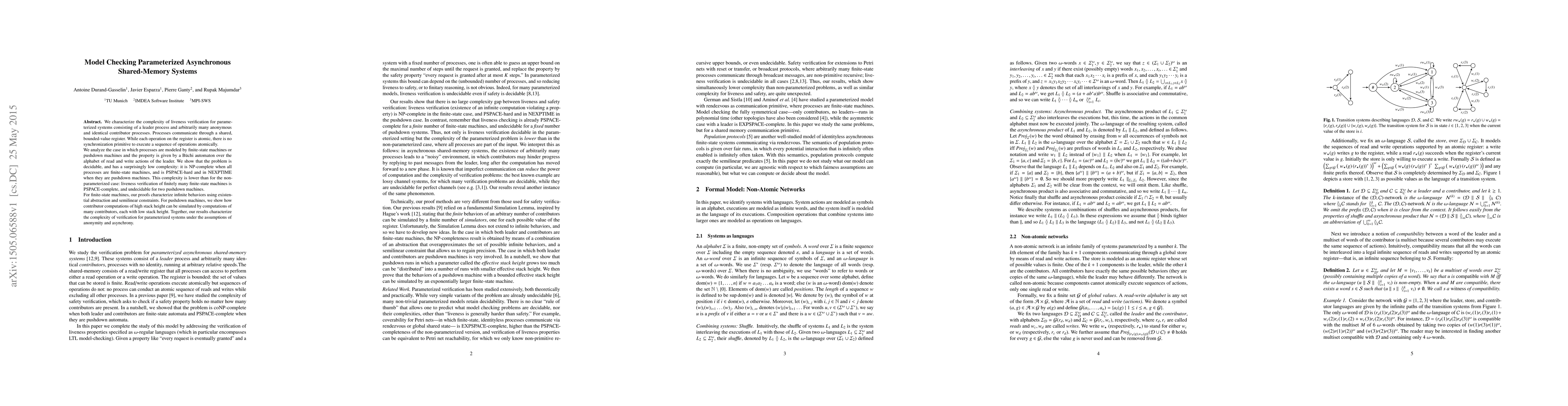 We characterize the complexity of liveness verification for parameterized systems consisting of a leader process and arbitrarily many anonymous and identical contributor processes. Processes communicate through a shared, bounded-value register. While each operation on the register is atomic, there is no synchronization primitive to execute a sequence of operations atomically. We analyze the case in which processes are modeled by finite-state machines or pushdown machines and the property is given by a B\"uchi automaton over the alphabet of read and write actions of the leader. We show that the problem is decidable, and has a surprisingly low complexity: it is NP-complete when all processes are finite-state machines, and is PSPACE-hard and in NEXPTIME when they are pushdown machines. This complexity is lower than for the non-parameterized case: liveness verification of finitely many finite-state machines is PSPACE-complete, and undecidable for two pushdown machines. For finite-state machines, our proofs characterize infinite behaviors using existential abstraction and semilinear constraints. For pushdown machines, we show how contributor computations of high stack height can be simulated by computations of many contributors, each with low stack height. Together, our results characterize the complexity of verification for parameterized systems under the assumptions of anonymity and asynchrony.