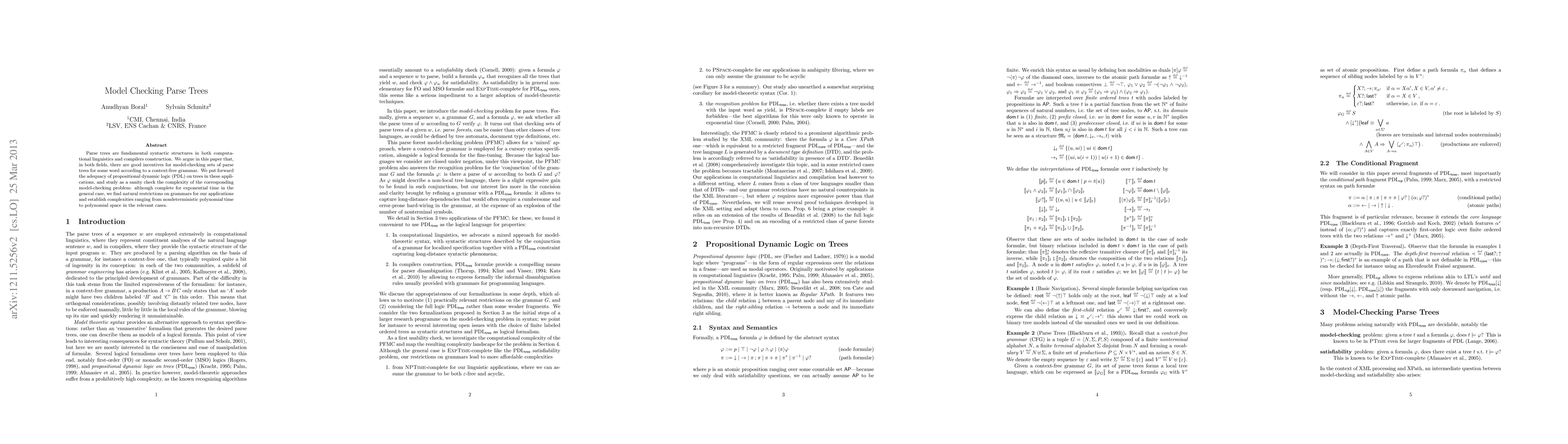 This paper investigates model checking parse trees using propositional dynamic logic on trees, finding that the complexity of the problem can range from nondeterministic polynomial time to polynomial space for specific grammars.