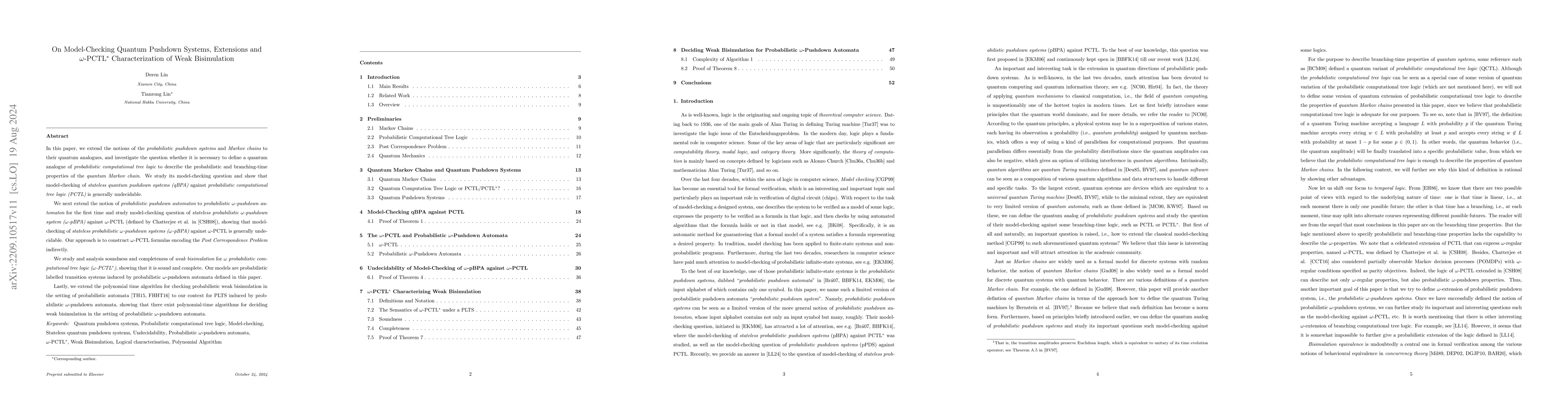 In this paper, we first resolve an open question in the probabilistic verification of infinite-state systems (specifically, the {\em stateless probabilistic pushdown systems}). We show that model checking {\em stateless probabilistic pushdown systems (pBPA)} against {\em probabilistic computational tree logic (PCTL)} is generally undecidable. We define the quantum analogues of the {\em probabilistic pushdown systems} and {\em Markov chains}, and further investigate whether it is necessary to define a quantum analogue of {\em probabilistic computational tree logic} to describe the branching-time properties of the {\em quantum Markov chain} defined in this paper. We study its model-checking question and show that the model-checking of {\em stateless quantum pushdown systems (qBPA)} against {\em probabilistic computational tree logic (PCTL)} is generally undecidable, with the immediate corollaries summarized. We define the notion of {\em probabilistic $\omega$-pushdown automaton} for the first time and study the model-checking question of {\em stateless probabilistic $\omega$-pushdown system ($\omega$-pBPA)} against $\omega$-PCTL (defined by Chatterjee et al. in \cite{CSH08}) and show that the model-checking of {\em stateless probabilistic $\omega$-pushdown systems ($\omega$-pBPA)} against $\omega$-PCTL is generally undecidable, with immediate consequences summarized. Our approach is to construct formulas of $\omega$-PCTL encoding the {\em Post Correspondence Problem} indirectly.