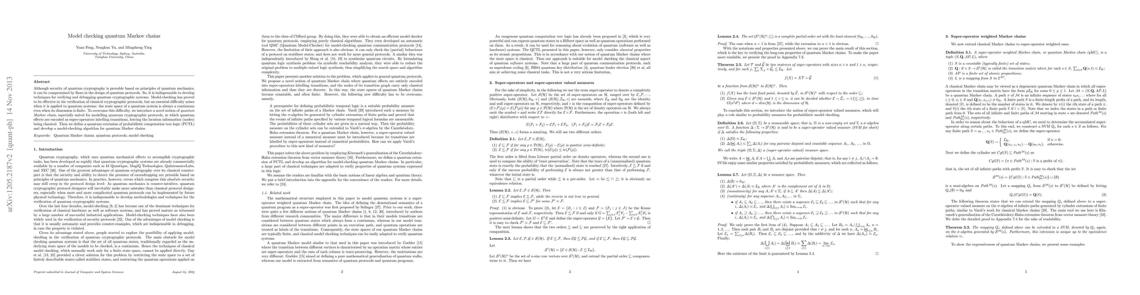 This paper introduces quantum Markov chains to model quantum cryptographic protocols, addressing the challenge of continuous state spaces in quantum systems. It proposes a quantum extension of probabilistic computation tree logic (PCTL) and develops a model-checking algorithm to verify the correctness of quantum protocols.