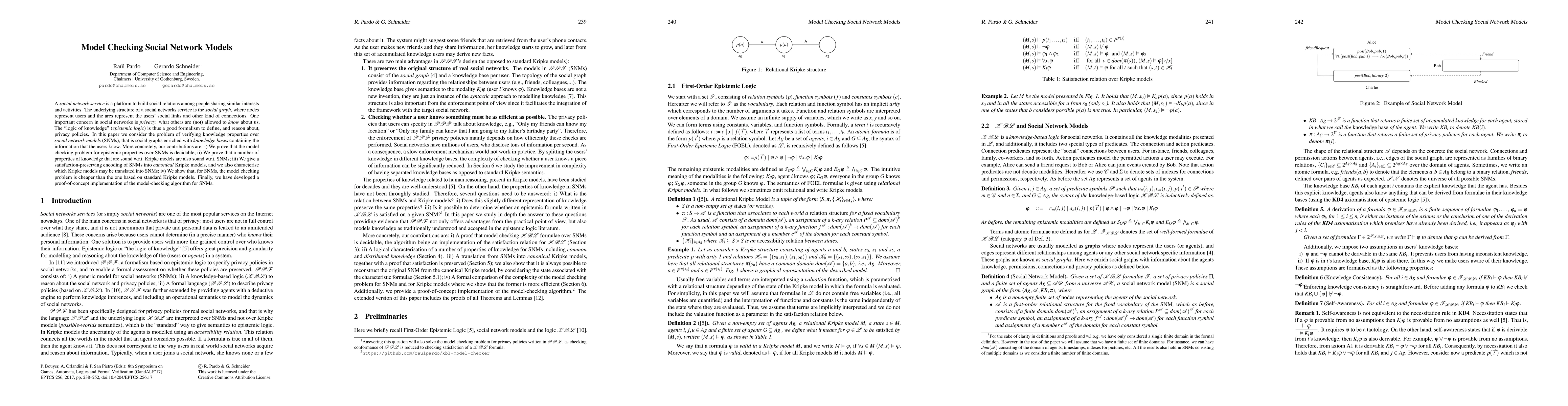 This paper proves that model checking privacy properties in social networks using epistemic logic is decidable. It also presents an encoding method from social network models to standard Kripke models, making verification more efficient, and provides a proof-of-concept implementation of the model-checking algorithm.