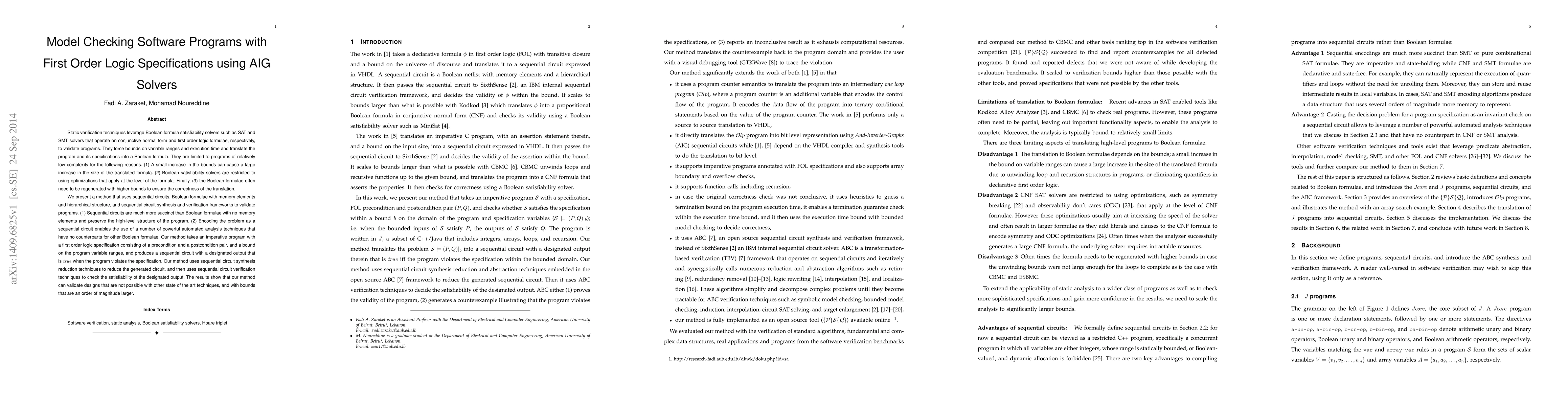 Static verification techniques leverage Boolean formula satisfiability solvers such as SAT and SMT solvers that operate on conjunctive normal form and first order logic formulae, respectively, to validate programs. They force bounds on variable ranges and execution time and translate the program and its specifications into a Boolean formula. They are limited to programs of relatively low complexity for the following reasons. (1) A small increase in the bounds can cause a large increase in the size of the translated formula. (2) Boolean satisfiability solvers are restricted to using optimizations that apply at the level of the formula. Finally, (3) the Boolean formulae often need to be regenerated with higher bounds to ensure the correctness of the translation. We present a method that uses sequential circuits, Boolean formulae with memory elements and hierarchical structure, and sequential circuit synthesis and verification frameworks to validate programs. (1) Sequential circuits are much more succinct than Boolean formulae with no memory elements and preserve the high-level structure of the program. (2) Encoding the problem as a sequential circuit enables the use of a number of powerful automated analysis techniques that have no counterparts for other Boolean formulae. Our method takes an imperative program with a first order logic specification consisting of a precondition and a postcondition pair, and a bound on the program variable ranges, and produces a sequential circuit with a designated output that is true when the program violates the specification.
