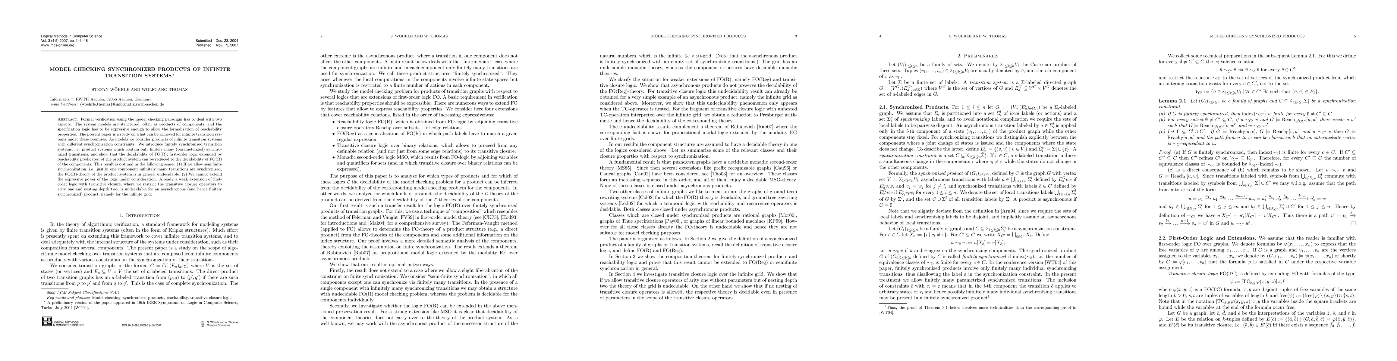 Formal verification using the model checking paradigm has to deal with two aspects: The system models are structured, often as products of components, and the specification logic has to be expressive enough to allow the formalization of reachability properties. The present paper is a study on what can be achieved for infinite transition systems under these premises. As models we consider products of infinite transition systems with different synchronization constraints. We introduce finitely synchronized transition systems, i.e. product systems which contain only finitely many (parameterized) synchronized transitions, and show that the decidability of FO(R), first-order logic extended by reachability predicates, of the product system can be reduced to the decidability of FO(R) of the components. This result is optimal in the following sense: (1) If we allow semifinite synchronization, i.e. just in one component infinitely many transitions are synchronized, the FO(R)-theory of the product system is in general undecidable. (2) We cannot extend the expressive power of the logic under consideration. Already a weak extension of first-order logic with transitive closure, where we restrict the transitive closure operators to arity one and nesting depth two, is undecidable for an asynchronous (and hence finitely synchronized) product, namely for the infinite grid.