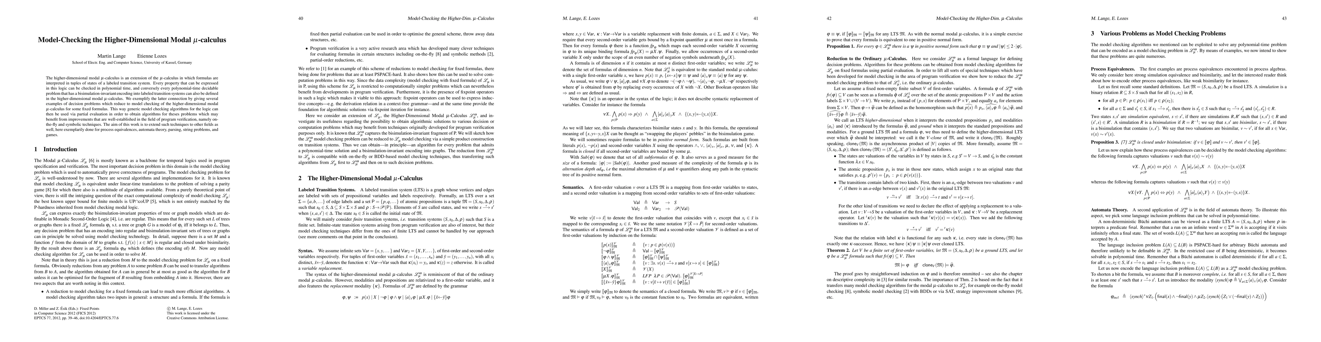 This paper explores the higher-dimensional modal mu-calculus, showing that properties expressed in this logic can be checked in polynomial time. It connects decidable problems with bisimulation-invariant encodings to the logic, leveraging generic model-checking algorithms to improve program verification techniques for diverse applications.
