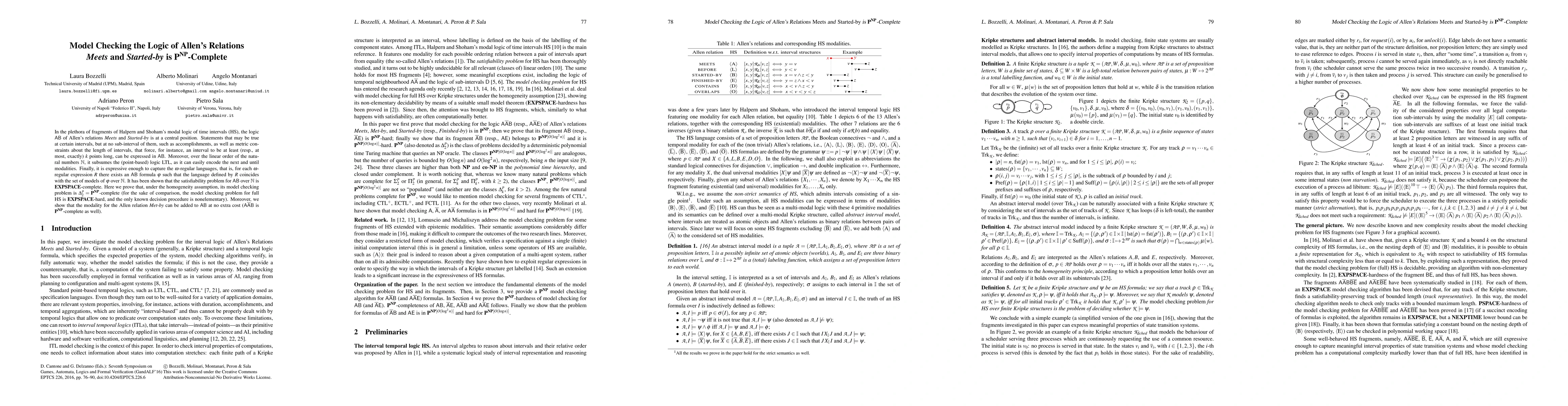 The paper proves that the model checking problem for Allen's relations Meets and Started-by logic is P^NP-complete under a homogeneity assumption, making it harder than its full HS counterpart.