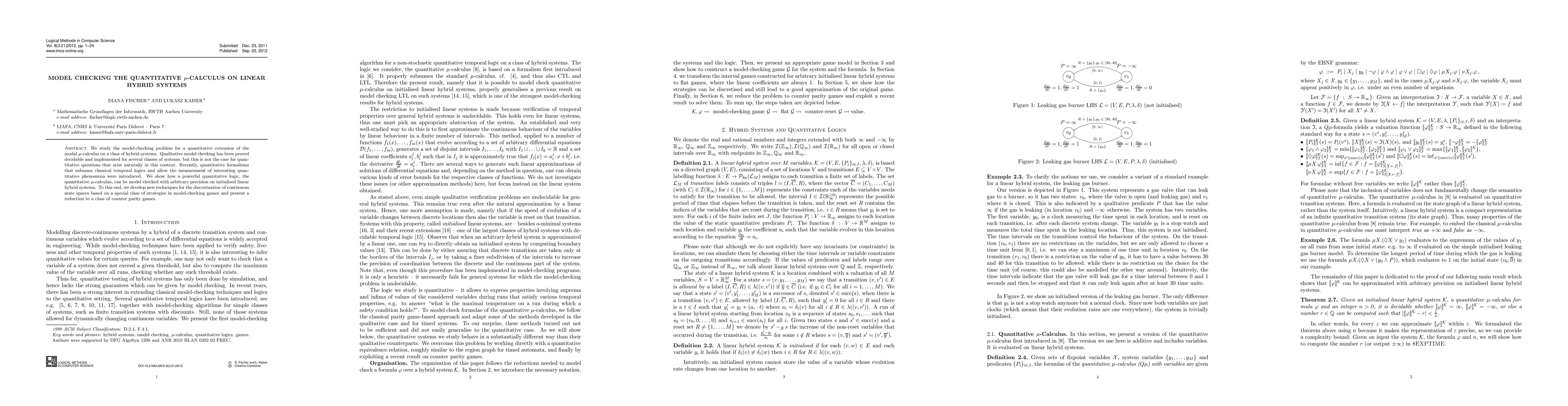 This paper presents techniques for model checking the quantitative mu-calculus on linear hybrid systems, introducing new discretization methods and reducing the problem to counter parity games for precise evaluation. The approach allows for the measurement of quantitative phenomena inherent in hybrid systems.