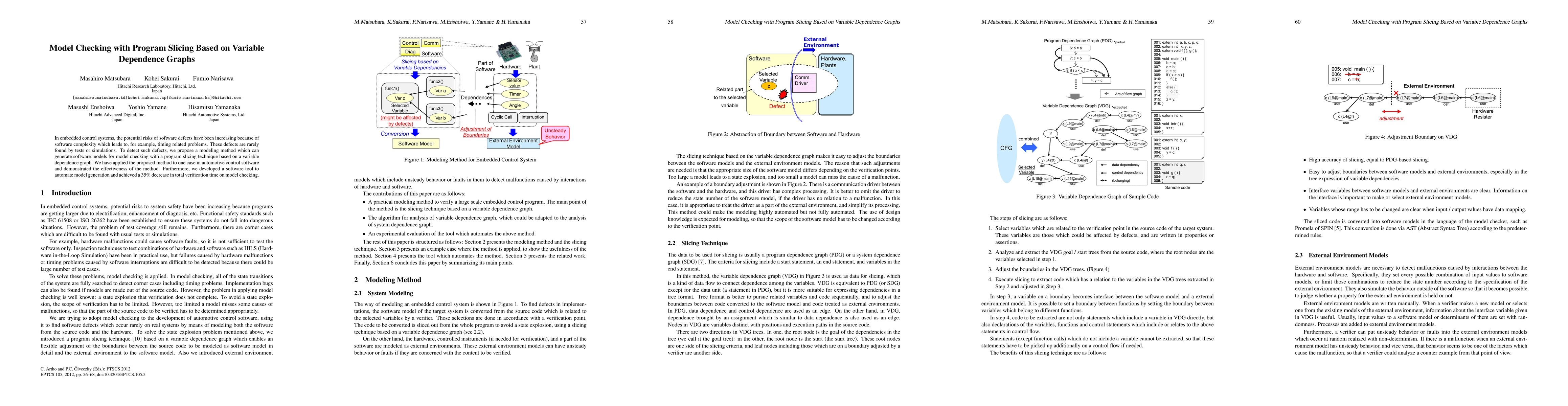 This paper proposes a method for generating software models using program slicing based on variable dependence graphs to detect defects in embedded control systems. The method was demonstrated on automotive control software, resulting in a 35% reduction in verification time through automated model generation.