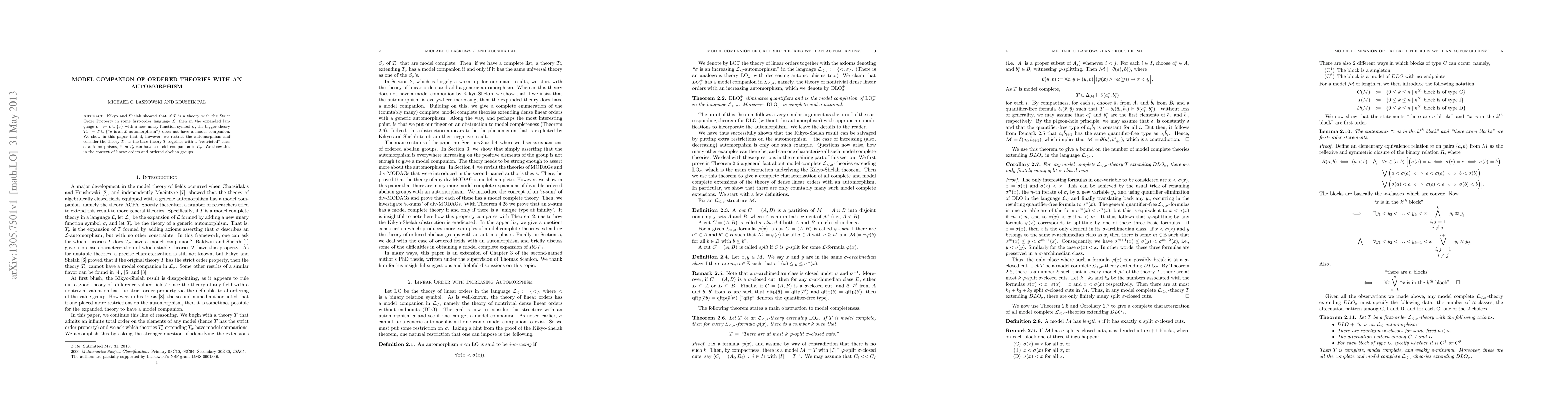Kikyo and Shelah showed that if $T$ is a theory with the Strict Order Property in some first-order language $\mathcal{L}$, then in the expanded language $\mathcal{L}_\sigma := \mathcal{L}\cup\{\sigma\}$ with a new unary function symbol $\sigma$, the bigger theory $T_\sigma := T\cup\{``\sigma \mbox{is an} \mathcal{L}\mbox{-automorphism''}\}$ does not have a model companion. We show in this paper that if, however, we restrict the automorphism and consider the theory $T_\sigma$ as the base theory $T$ together with a ``restricted'' class of automorphisms, then $T_\sigma$ can have a model companion in $\mathcal{L}_\sigma$. We show this in the context of linear orders and ordered abelian groups.