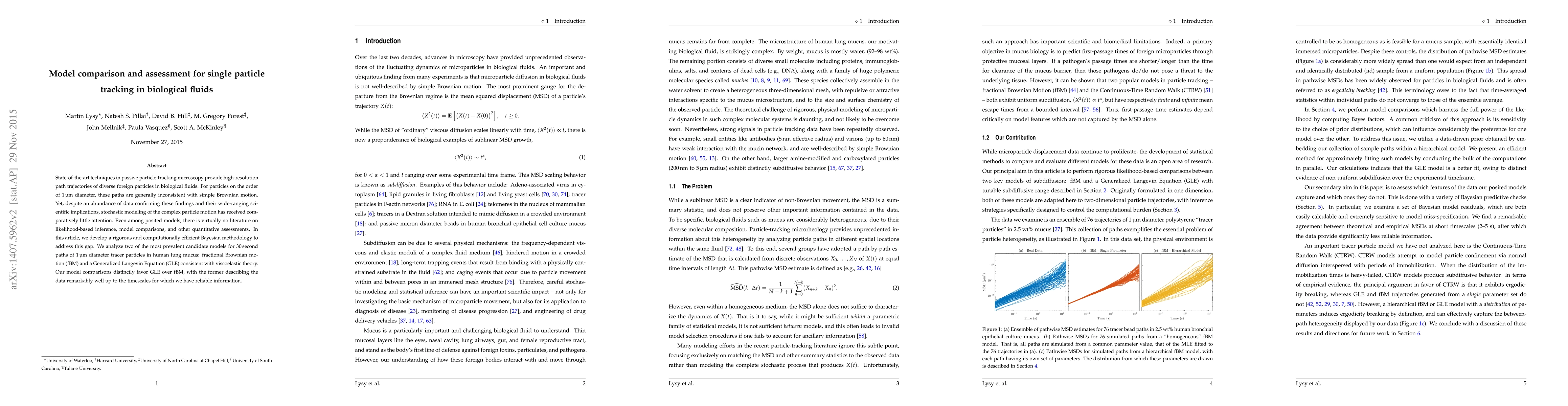 State-of-the-art techniques in passive particle-tracking microscopy provide high-resolution path trajectories of diverse foreign particles in biological fluids. For particles on the order of 1 micron diameter, these paths are generally inconsistent with simple Brownian motion. Yet, despite an abundance of data confirming these findings and their wide-ranging scientific implications, stochastic modeling of the complex particle motion has received comparatively little attention. Even among posited models, there is virtually no literature on likelihood-based inference, model comparisons, and other quantitative assessments. In this article, we develop a rigorous and computationally efficient Bayesian methodology to address this gap. We analyze two of the most prevalent candidate models for 30 second paths of 1 micron diameter tracer particles in human lung mucus: fractional Brownian motion (fBM) and a Generalized Langevin Equation (GLE) consistent with viscoelastic theory. Our model comparisons distinctly favor GLE over fBM, with the former describing the data remarkably well up to the timescales for which we have reliable information.