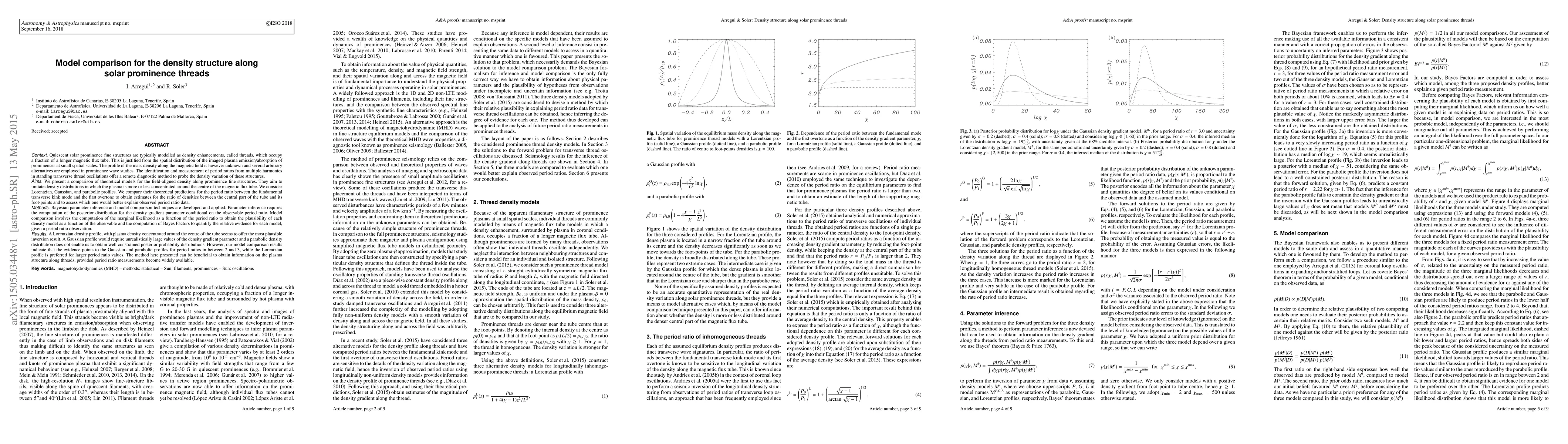 This paper compares Lorentzian, Gaussian, and parabolic density profiles for solar prominence threads, using Bayesian inference and model comparison techniques to determine which model best explains observed period ratios. The Lorentzian profile, indicating higher central density, is most plausible overall, though Gaussian and parabolic profiles show better fit for intermediate period ratios.