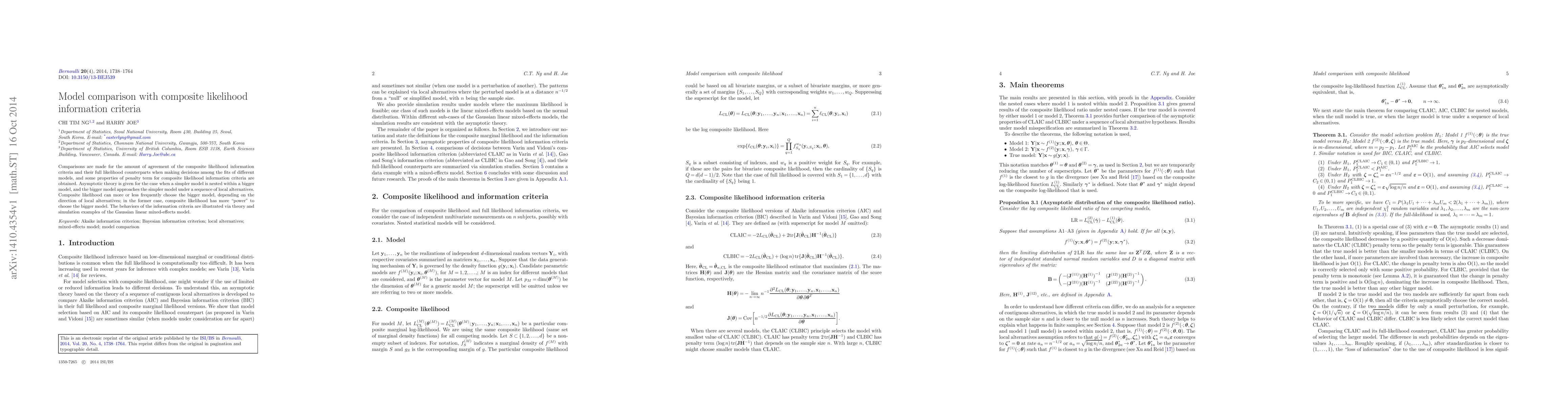 Comparisons are made for the amount of agreement of the composite likelihood information criteria and their full likelihood counterparts when making decisions among the fits of different models, and some properties of penalty term for composite likelihood information criteria are obtained. Asymptotic theory is given for the case when a simpler model is nested within a bigger model, and the bigger model approaches the simpler model under a sequence of local alternatives. Composite likelihood can more or less frequently choose the bigger model, depending on the direction of local alternatives; in the former case, composite likelihood has more "power" to choose the bigger model. The behaviors of the information criteria are illustrated via theory and simulation examples of the Gaussian linear mixed-effects model.