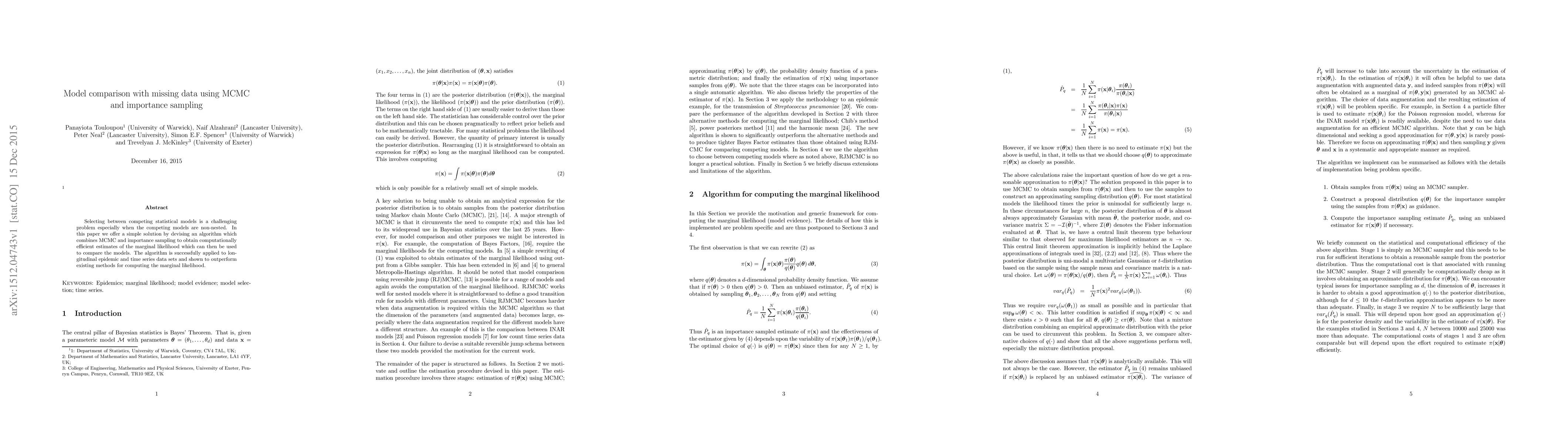 Selecting between competing statistical models is a challenging problem especially when the competing models are non-nested. In this paper we offer a simple solution by devising an algorithm which combines MCMC and importance sampling to obtain computationally efficient estimates of the marginal likelihood which can then be used to compare the models. The algorithm is successfully applied to longitudinal epidemic and time series data sets and shown to outperform existing methods for computing the marginal likelihood.